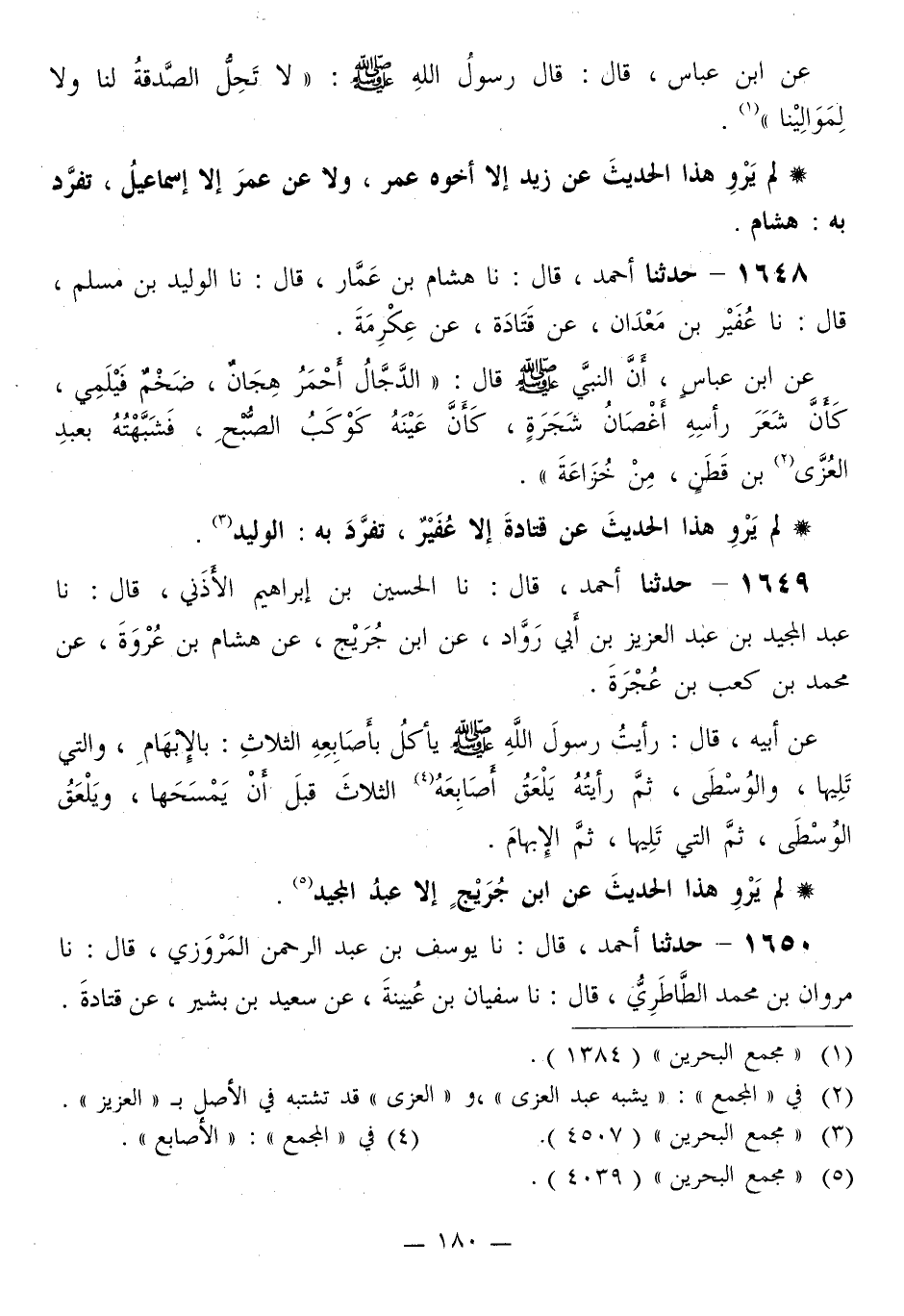 1648 - حَدَّثَنَا أَحْمَدُ قَالَ: نا هِشَامُ بْنُ عَمَّارٍ قَالَ: نا الْوَلِيدُ بْنُ مُسْلِمٍ قَالَ: نا عُفَيْرُ بْنُ مَعْدَانَ، عَنْ قَتَادَةَ، عَنْ عِكْرِمَةَ، عَنِ ابْنِ عَبَّاسٍ، أَنَّ النَّبِيَّ صَلَّى اللهُ عَلَيْهِ وَسَلَّمَ قَالَ: «§الدَّجَّالُ أَحْمَرُ هِجَانٌ، ضَخْمٌ فَيْلَمِيٌّ، كَأَنَّ شَعْرَ رَأْسِهِ أَغْصَانُ شَجَرَةٍ، كَأَنَّ عَيْنَهُ كَوْكَبُ الصُّبْحِ، فَشَبَّهْتُهُ بِعَبْدِ الْعُزَّى بْنِ قَطَنٍ، مِنْ خُزَاعَةَ»