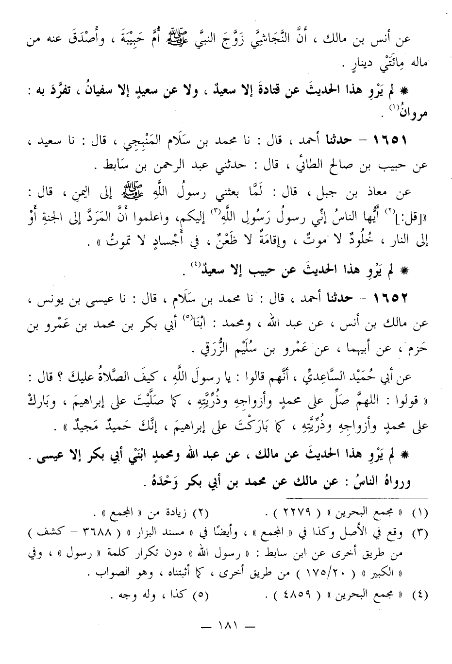 1651 - حَدَّثَنَا أَحْمَدُ قَالَ: نا مُحَمَّدُ بْنُ سَلَامٍ الْمَنْبِجِيُّ قَالَ: نا سَعِيدٌ، عَنْ حَبِيبِ بْنِ صَالِحٍ الطَّائِيُّ قَالَ: حَدَّثَنِي عَبْدُ الرَّحْمَنِ بْنُ سَابِطٍ، عَنْ مُعَاذِ بْنِ جَبَلٍ قَالَ: لَمَّا بَعَثَنِي رَسُولُ اللَّهِ صَلَّى اللهُ عَلَيْهِ وَسَلَّمَ إِلَى الْيَمَنِ قَالَ: «قُلْ: أَيُّهَا النَّاسُ §إِنِّي رَسُولُ رَسُولِ اللَّهِ إِلَيْكُمْ، وَاعْلَمُوا أَنَّ الْمَرَدَّ إِلَى الْجَنَّةِ أَوْ إِلَى النَّارِ، خُلُودٌ لَا مَوْتٌ، وَإِقَامَةٌ لَا ظَعْنٌ، فِي أَجْسَادٍ لَا تَمُوتُ»