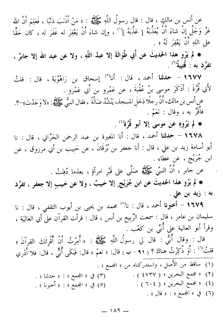 1677 - حَدَّثَنَا أَحْمَدُ قَالَ: أنا إِسْحَاقُ بْنُ رَاهُوَيْهِ قَالَ: قُلْتُ لِأَبِي قُرَّةَ: أَذَكَرَ مُوسَى بْنُ عُقْبَةَ، عَنْ عَمْرِو بْنِ أَبِي عَمْرٍو، عَنْ أَنَسِ بْنِ مَالِكٍ، أَنَّ §رَجُلًا دَخَلَ الْمَسْجِدَ، يَنْشُدُ ضَالَّةً، فَقَالَ النَّبِيُّ صَلَّى اللهُ عَلَيْهِ وَسَلَّمَ: «لَا وَجَدْتَ» ؟ . فَأَقَرَّ بِهِ، وَقَالَ: نَعَمْ «