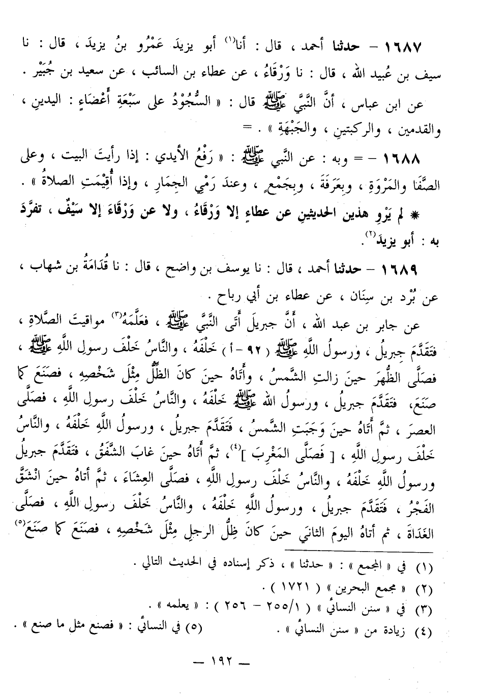 1687 - حَدَّثَنَا أَحْمَدُ قَالَ: أَنَا أَبُو يَزِيدَ عَمْرُو بْنُ يَزِيدَ قَالَ: نا سَيْفُ بْنُ عُبَيْدِ اللَّهِ قَالَ: نا وَرْقَاءُ، عَنْ عَطَاءِ بْنِ السَّائِبِ، عَنْ سَعِيدِ بْنِ جُبَيْرٍ، عَنِ ابْنِ عَبَّاسٍ، أَنَّ النَّبِيَّ صَلَّى اللهُ عَلَيْهِ وَسَلَّمَ قَالَ: «§السُّجُودُ عَلَى سَبْعَةِ أَعْضَاءٍ: الْيَدَيْنِ، وَالْقَدَمَيْنِ، وَالرُّكْبَتَيْنِ، وَالْجَبْهَةِ»