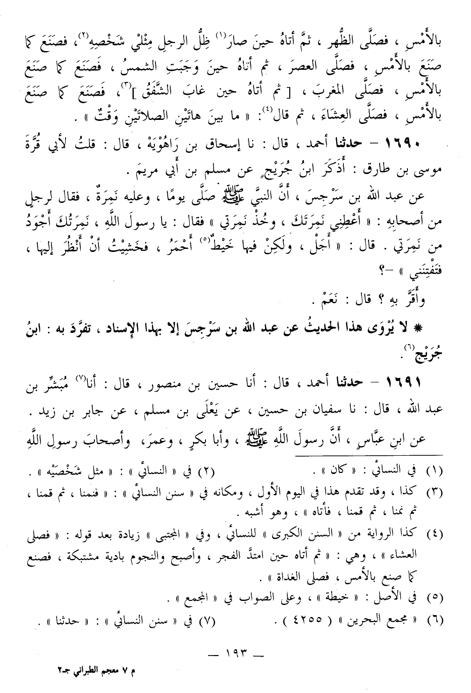 1690 - حَدَّثَنَا أَحْمَدُ قَالَ: نا إِسْحَاقُ بْنُ رَاهُوَيْهِ قَالَ: قُلْتُ لِأَبِي قُرَّةَ مُوسَى بْنِ طَارِقٍ: أَذَكَرَ ابْنُ جَرِيحٍ، عَنْ مُسْلِمِ بْنِ أَبِي مَرْيَمَ، عَنْ عَبْدِ اللَّهِ بْنِ سَرْجِسَ، أَنَّ النَّبِيَّ صَلَّى اللهُ عَلَيْهِ وَسَلَّمَ صَلَّى يَوْمًا، وَعَلَيْهِ نَمِرَةٌ، فَقَالَ لِرَجُلٍ مِنْ أَصْحَابِهِ: «§أَعْطِنِي نَمِرَتَكَ، وَخُذْ نَمِرَتِي» فَقَالَ: يَا رَسُولَ اللَّهِ، نَمِرَتُكَ أَجْوَدُ مِنْ نَمِرَتِي. قَالَ: «أَجَلْ، وَلَكِنْ فِيهَا خَيْطٌ أَحْمَرُ، فَخَشِيتُ أَنْ أَنْظُرَ إِلَيْهَا، فَتَفْتِنَنِي» ؟ وَأَقَرَّ بِهِ؟ قَالَ: نَعَمْ. «