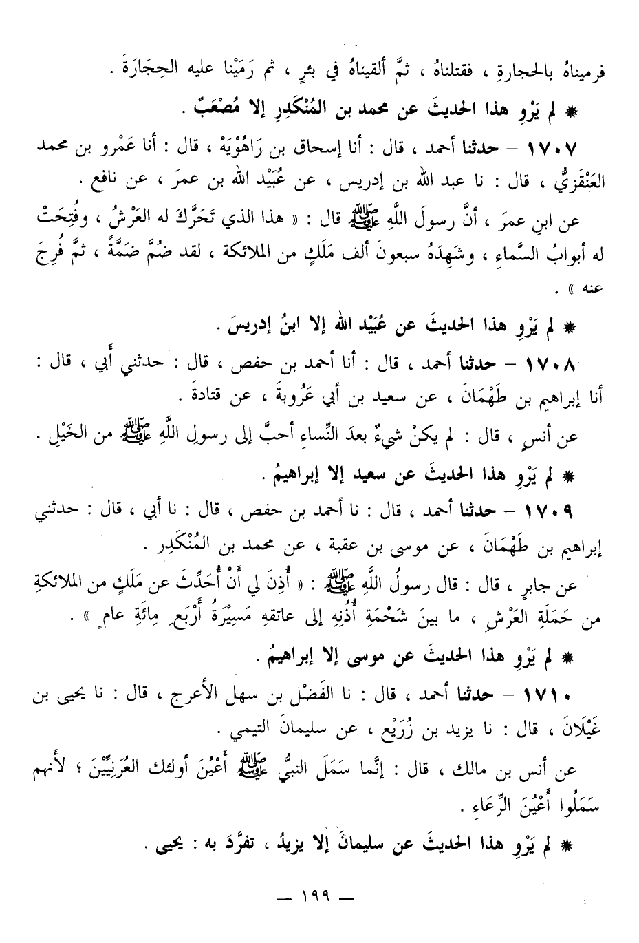 1709 - حَدَّثَنَا أَحْمَدُ قَالَ: نا أَحْمَدُ بْنُ حَفْصٍ قَالَ: نا أَبِي قَالَ: حَدَّثَنِي إِبْرَاهِيمُ بْنُ طَهْمَانَ، عَنْ مُوسَى بْنِ عُقْبَةَ، عَنْ مُحَمَّدِ بْنِ الْمُنْكَدِرِ، عَنْ جَابِرٍ قَالَ: قَالَ: رَسُولُ اللَّهِ صَلَّى اللهُ عَلَيْهِ وَسَلَّمَ: «§أُذِنَ لِي أَنْ أُحَدِّثَ عَنْ مَلَكٍ مِنَ الْمَلَائِكَةِ مِنْ حَمَلَةِ الْعَرْشِ، مَا بَيْنَ شَحْمَةِ أُذُنِهِ إِلَى عَاتِقِهِ مَسِيرَةُ أَرْبَعِ مِائَةِ عَامٍ»