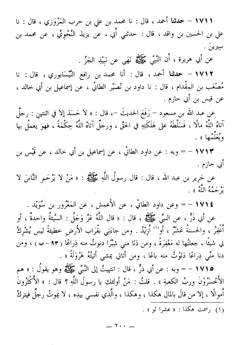 1712 - حَدَّثَنَا أَحْمَدُ قَالَ: أَنَا مُحَمَّدُ بْنُ رَافِعٍ النَّيْسَابُورِيُّ قَالَ: نا مُصْعَبُ بْنُ الْمِقْدَامِ قَالَ: نا دَاوُدُ بْنُ نُصَيْرٍ الطَّائِيُّ، عَنْ إِسْمَاعِيلَ بْنِ أَبِي خَالِدٍ، عَنْ قَيْسِ بْنِ أَبِي حَازِمٍ، عَنْ عَبْدِ اللَّهِ بْنِ مَسْعُودٍ، رَفَعَ الْحَدِيثَ قَالَ: «§لَا حَسَدَ إِلَّا فِي اثْنَتَيْنِ: رَجُلٌ آتَاهُ اللَّهُ مَالًا، فَسَلَّطَهُ عَلَى هَلَكَتِهِ فِي الْحَقِّ، وَرَجُلٌ آتَاهُ اللَّهُ حِكْمَةً، فَهُوَ يَعْمَلُ بِهَا وَيُعَلِّمُهَا»