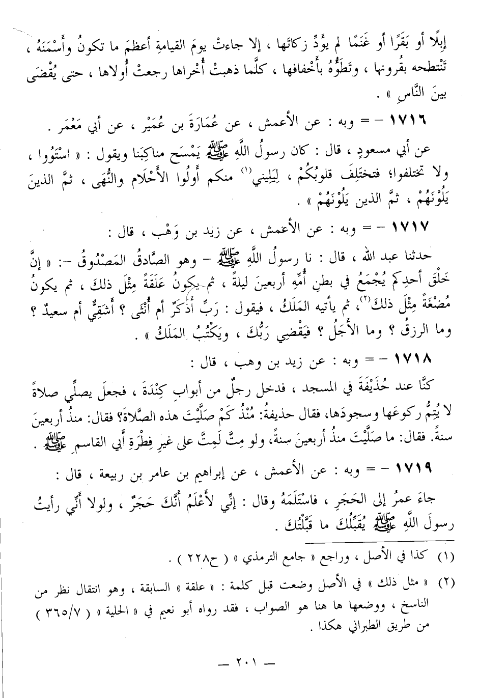 1717 - وَبِهِ: عَنِ الْأَعْمَشِ، عَنْ زَيْدِ بْنِ وَهْبٍ قَالَ: حَدَّثَنَا عَبْدُ اللَّهِ قَالَ: نا عَبْدُ اللَّهِ قَالَ: نا رَسُولُ اللَّهِ صَلَّى اللهُ عَلَيْهِ وَسَلَّمَ وَهُوَ الصَّادِقُ الْمَصْدُوقُ: «إِنَّ §خَلْقَ أَحَدِكُمْ يُجْمَعُ فِي بَطْنِ أُمِّهِ أَرْبَعِينَ لَيْلَةً، ثُمَّ يَكُونُ عَلَقَةً مِثْلَ ذَلِكَ، ثُمَّ يَكُونُ مُضْغَةً مِثْلَ ذَلِكَ، ثُمَّ يَأْتِيهِ الْمَلَكُ، فَيَقُولُ: رَبِّ أَذَكَرٌ أَمْ أُنْثَى؟ أَشَقِيٌّ أَمْ سَعِيدٌ؟ وَمَا الرِّزْقُ؟ وَمَا الْأَجَلُ؟ فَيَقْضِي رَبُّكَ، وَيَكْتُبُ الْمَلَكُ»