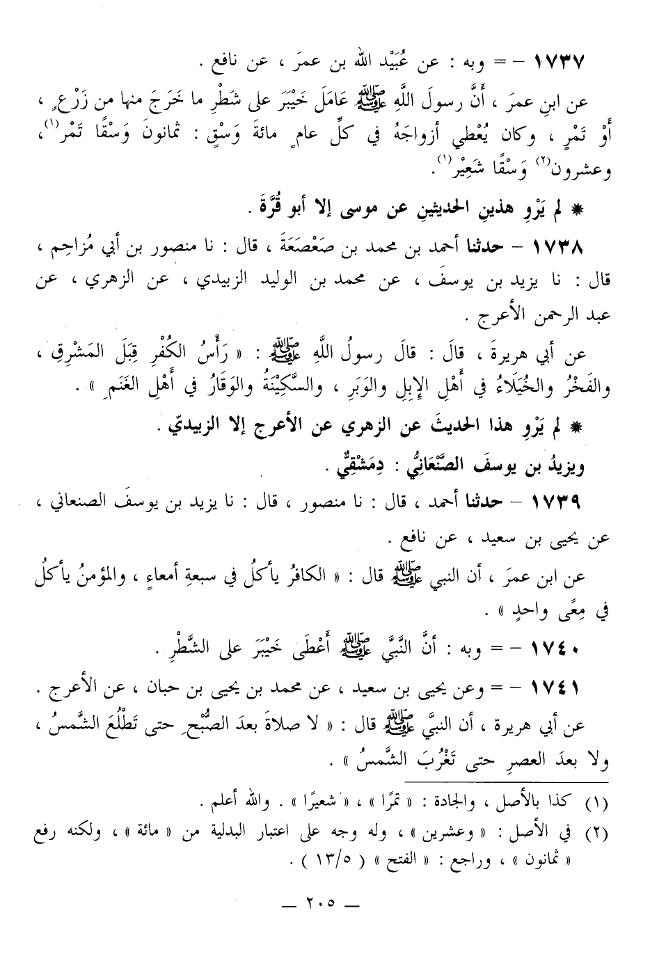 1737 - وَبِهِ: عَنْ عُبَيْدِ اللَّهِ بْنِ عُمَرَ، عَنْ نَافِعٍ، عَنِ ابْنِ عُمَرَ، «أَنَّ رَسُولَ اللَّهِ صَلَّى اللهُ عَلَيْهِ وَسَلَّمَ §عَامَلَ خَيْبَرَ عَلَى شَطْرِ مَا خَرَجَ مِنْهَا مِنْ زَرْعٍ، أَوْ تَمْرٍ، وَكَانَ يُعْطِي أَزْوَاجَهُ فِي كُلِّ عَامٍ مِائَةَ وَسْقٍ: ثَمَانُونَ وَسْقَ تَمْرٍ، وَعِشْرُينَ وَسْقَ شَعِيرٍ»