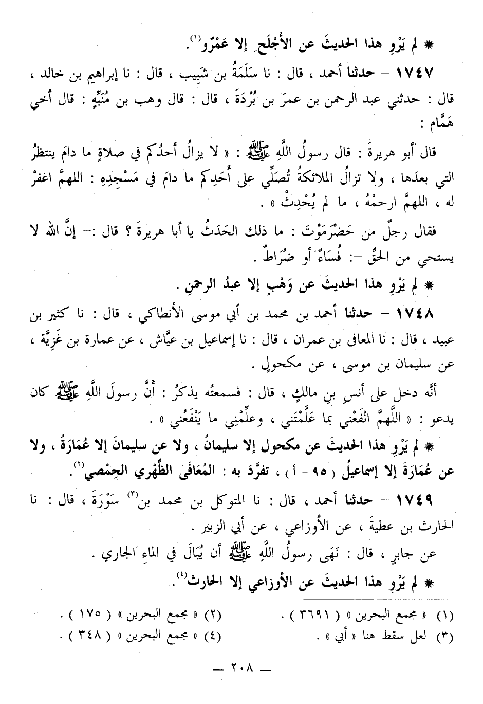 1747 - حَدَّثَنَا أَحْمَدُ قَالَ: نا سَلَمَةُ بْنُ شَبِيبٍ قَالَ: نا إِبْرَاهِيمُ بْنُ خَالِدٍ قَالَ: حَدَّثَنِي عَبْدُ الرَّحْمَنِ بْنُ عُمَرَ بْنِ بُرْدَةَ قَالَ: قَالَ وَهْبُ بْنُ مُنَبِّهٍ: قَالَ أَخِي هَمَّامٌ: قَالَ أَبُو هُرَيْرَةَ: قَالَ رَسُولُ اللَّهِ صَلَّى اللهُ عَلَيْهِ وَسَلَّمَ: «§لَا يَزَالُ أَحَدُكُمْ فِي صَلَاةٍ مَا مَا دَامَ يَنْتَظِرُ الَّتِي بَعْدَهَا، وَلَا تَزَالُ الْمَلَائِكَةُ تُصَلِّي عَلَى أَحَدِكُمْ مَا دَامَ فِي مَسْجِدِهِ: اللَّهُمَّ اغْفِرْ لَهُ، اللَّهُمَّ ارْحَمْهُ، مَا لَمْ يُحْدِثْ» فَقَالَ رَجُلٌ مِنْ حَضْرَمَوْتَ: مَا ذَلِكَ الْحَدَثُ يَا أَبَا هُرَيْرَةَ؟ قَالَ: «إِنَّ اللَّهَ لَا يَسْتَحِي مِنَ الْحَقِّ: فُسَاءٌ أَوْ ضُرَاطٌ»
