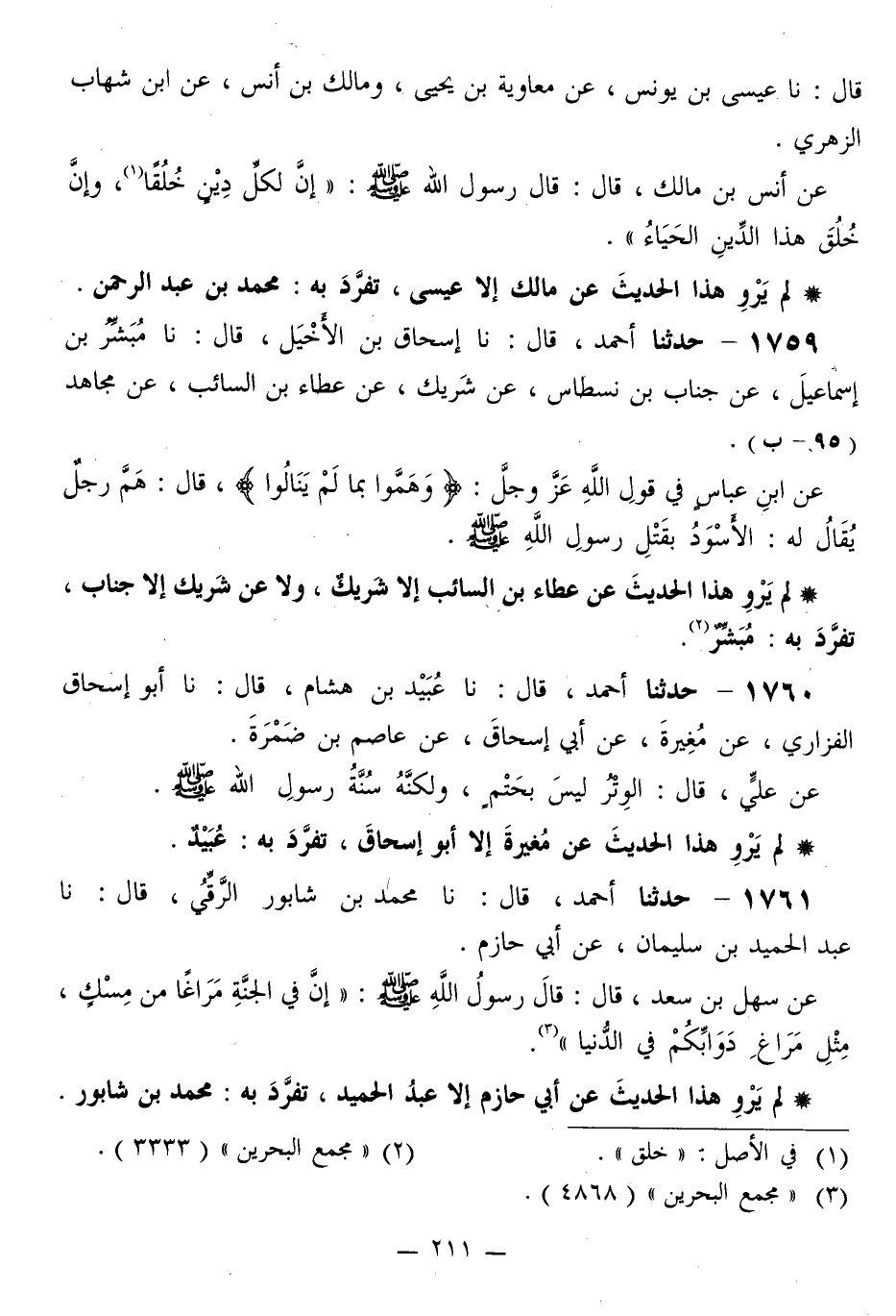 1761 - حَدَّثَنَا أَحْمَدُ قَالَ: نا مُحَمَّدُ بْنُ شَابُورَ الرَّقِّيُّ قَالَ: نا عَبْدُ الْحَمِيدِ بْنُ سُلَيْمَانَ، عَنْ أَبِي حَازِمٍ، عَنْ سَهْلِ بْنِ سَعْدٍ قَالَ: قَالَ رَسُولُ اللَّهِ صَلَّى اللهُ عَلَيْهِ وَسَلَّمَ: «إِنَّ §فِي الْجَنَّةِ مَرَاغًا مِنْ مِسْكٍ، مِثْلَ مَرَاغِ دَوَابِّكُمْ فِي الدُّنْيَا»