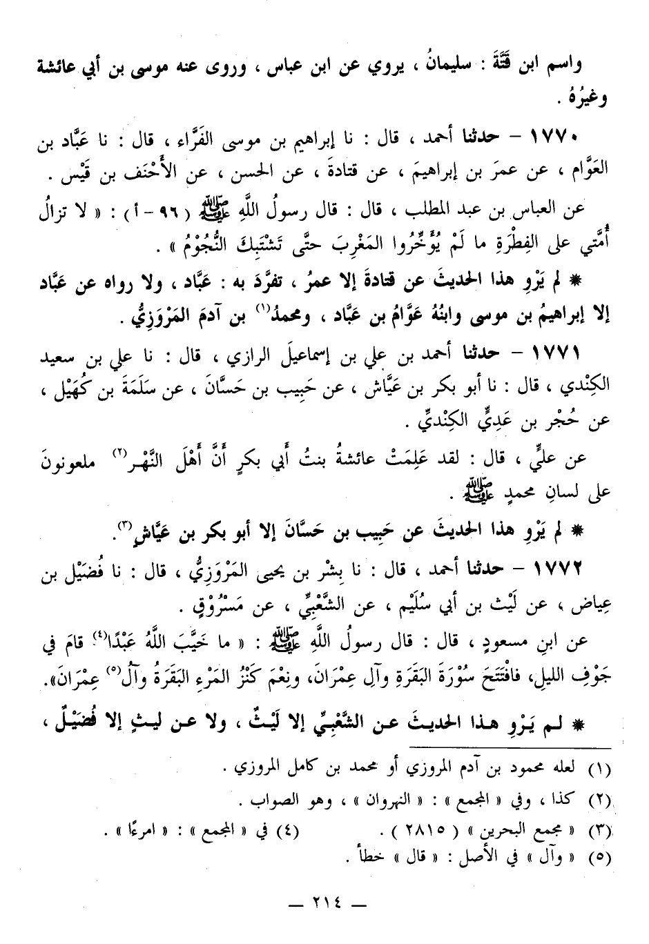 1772 - حَدَّثَنَا أَحْمَدُ قَالَ: نا بِشْرُ بْنُ يَحْيَى الْمَرْوَزِيُّ قَالَ: نا فُضَيْلُ بْنُ عِيَاضٍ، عَنْ لَيْثِ بْنِ أَبِي سُلَيْمٍ، عَنِ الشَّعْبِيِّ، عَنْ مَسْرُوقٍ، عَنِ ابْنِ مَسْعُودٍ قَالَ: قَالَ رَسُولُ اللَّهِ صَلَّى اللهُ عَلَيْهِ وَسَلَّمَ: «§مَا خَيَّبَ اللَّهُ عَبْدًا قَامَ فِي جَوْفِ اللَّيْلِ، فَافْتَتَحَ سُورَةَ الْبَقَرَةِ وَآلَ عِمْرَانَ، وَنِعْمَ كَنْزُ الْمَرْءِ الْبَقَرَةُ، وَآلُ عِمْرَانَ»