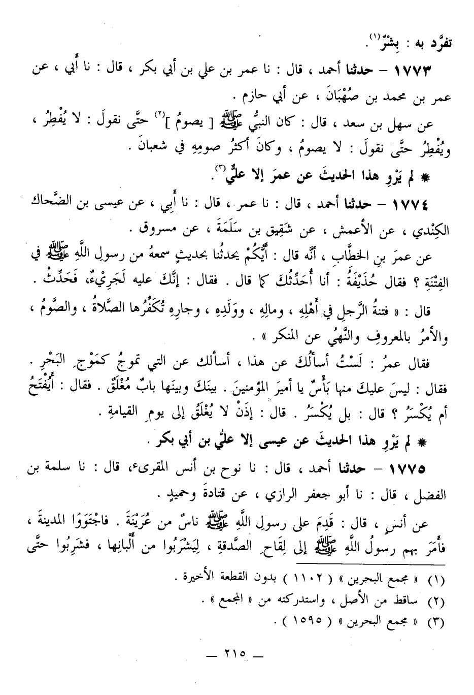 1774 - حَدَّثَنَا أَحْمَدُ قَالَ: نا عُمَرُ قَالَ: نا أَبِي، عَنْ عِيسَى بْنِ الضَّحَّاكِ الْكِنْدِيِّ، عَنِ الْأَعْمَشِ، عَنْ شَقِيقِ بْنِ سَلَمَةَ، عَنْ مَسْرُوقٍ، عَنْ عُمَرَ بْنِ الْخَطَّابِ، أَنَّهُ قَالَ: أَيُّكُمْ يُحَدِّثُنَا بِحَدِيثٍ سَمِعَهُ مِنْ رَسُولِ اللَّهِ صَلَّى اللهُ عَلَيْهِ وَسَلَّمَ فِي الْفِتْنَةِ؟ فَقَالَ حُذَيْفَةُ: أَنَا أُحَدِّثُكَ كَمَا قَالَ. فَقَالَ: إِنَّكَ عَلَيْهِ لَجَرِيءٌ، فَحَدِّثْ. قَالَ: «§فِتْنَةُ الرَّجُلِ فِي أَهْلِهِ، وَمَالِهِ، وَوَلَدِهِ، وَجَارِهِ تُكَفِّرُهَا الصَّلَاةُ، وَالصَّوْمُ، وَالْأَمْرُ بِالْمَعْرُوفِ، وَالنَّهْيُ عَنِ الْمُنْكَرِ» فَقَالَ عُمَرُ: «لَسْتُ أَسْأَلُكَ عَنْ هَذَا، أَسْأَلُكَ عَنِ الَّتِي تَمُوجُ كَمَوْجِ الْبَحْرِ» . فَقَالَ: لَيْسَ عَلَيْكَ مِنْهَا بَأْسٌ يَا أَمِيرَ الْمُؤْمِنِينَ. بَيْنَكَ وَبَيْنَهَا بَابٌ مُغْلَقٌ. فَقَالَ: «أَيُفْتَحُ أَمْ يُكْسَرُ؟» قَالَ: بَلْ يُكْسَرُ. قَالَ: «إِذَنْ لَا يُغْلَقُ إِلَى يَوْمِ الْقِيَامَةِ» . «