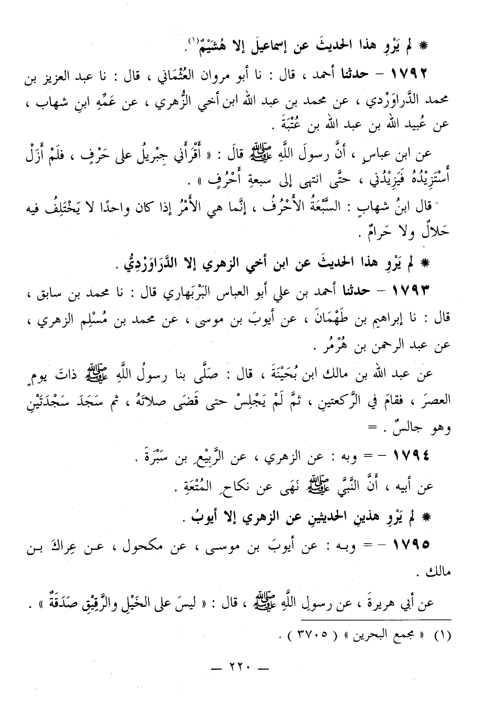 1792 - حَدَّثَنَا أَحْمَدُ قَالَ: نا أَبُو مَرْوَانَ الْعُثْمَانِيُّ قَالَ: نا عَبْدُ الْعَزِيزِ بْنُ مُحَمَّدٍ الدَّرَاوَرْدِيُّ، عَنْ مُحَمَّدِ بْنِ عَبْدِ اللَّهِ ابْنِ أَخِي الزُّهْرِيِّ، عَنْ عَمِّهِ ابْنِ شِهَابٍ، عَنْ عُبَيْدِ اللَّهِ بْنِ عَبْدِ اللَّهِ بْنِ عُتْبَةَ، عَنِ ابْنِ عَبَّاسٍ، أَنَّ رَسُولَ اللَّهِ صَلَّى اللهُ عَلَيْهِ وَسَلَّمَ قَالَ: «§أَقْرَأَنِي جِبْرِيلُ عَلَى حَرْفٍ، فَلَمْ أَزَلْ أَسْتَزِيدُهُ فَيَزِيدُنِي، حَتَّى انْتَهَى إِلَى سَبْعَةِ أَحْرُفٍ» . قَالَ ابْنُ شِهَابٍ: «السَّبْعَةُ الْأَحْرُفِ، إِنَّمَا هِيَ الْأَمْرُ إِذَا كَانَ وَاحِدًا لَا يَخْتَلِفُ فِيهِ حَلَالٌ وَلَا حَرَامٌ» ، «