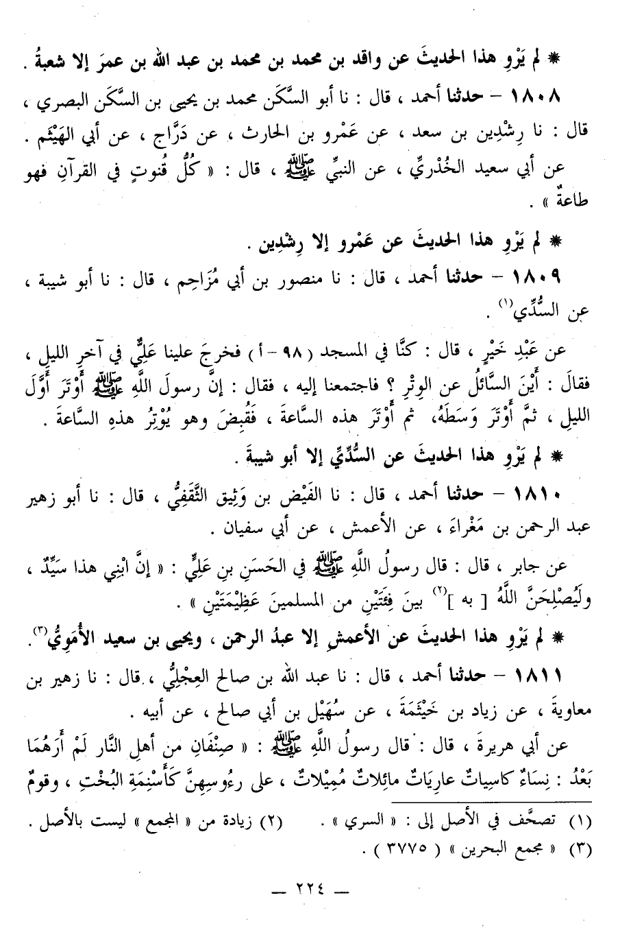 1810 - حَدَّثَنَا أَحْمَدُ قَالَ: نا الْفَيْضُ بْنُ وَثِيقٍ الثَّقَفِيُّ قَالَ: نا أَبُو زُهَيْرٍ عَبْدُ الرَّحْمَنِ بْنُ مَغْرَاءَ، عَنِ الْأَعْمَشِ، عَنْ أَبِي سُفْيَانَ، عَنْ جَابِرٍ قَالَ: قَالَ رَسُولُ اللَّهِ صَلَّى اللهُ عَلَيْهِ وَسَلَّمَ فِي الْحَسَنِ بْنِ عَلِيٍّ: «إِنَّ §ابْنِي هَذَا سَيِّدٌ، وَلَيُصْلِحَنَّ اللَّهُ بِهِ بَيْنَ فِئَتَيْنِ مِنَ الْمُسْلِمِينَ عَظِيمَتَيْنِ»