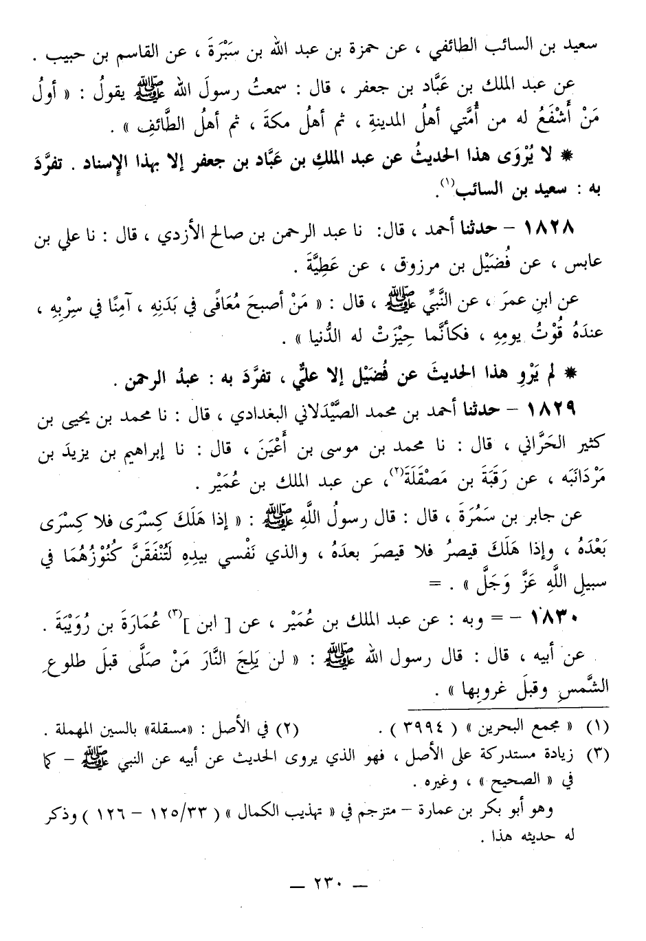 1830 - وَبِهِ: عَنْ عَبْدِ الْمَلِكِ بْنِ عُمَيْرٍ، عَنِ ابْنِ عُمَارَةَ بْنِ رُوَيْبَةَ، عَنْ أَبِيهِ قَالَ: قَالَ رَسُولُ اللَّهِ صَلَّى اللهُ عَلَيْهِ وَسَلَّمَ: «§لَنْ يَلِجَ النَّارَ مَنْ صَلَّى قَبْلَ طُلُوعِ الشَّمْسِ وَقَبْلَ غُرُوبِهَا» -[231]- لَمْ يَرْوِ هَذَيْنِ الْحَدِيثَيْنِ عَنْ رَقَبَةَ إِلَّا إِبْرَاهِيمَ "