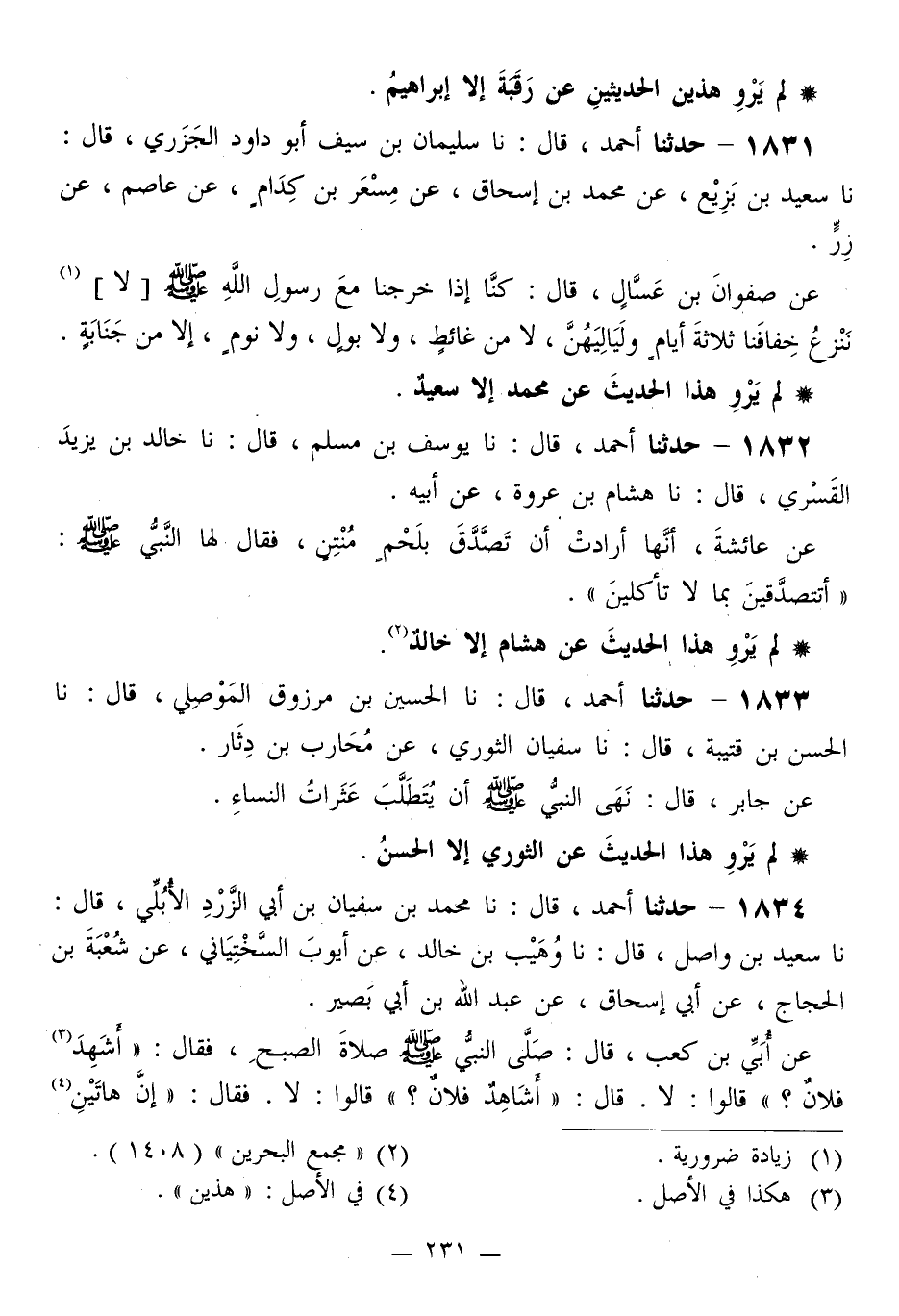 1831 - حَدَّثَنَا أَحْمَدُ قَالَ: نا سُلَيْمَانُ بْنُ سَيْفٍ أَبُو دَاوُدَ الْجَزَرِيُّ قَالَ: نا سَعِيدُ بْنُ بَزِيعٍ، عَنْ مُحَمَّدِ بْنِ إِسْحَاقَ، عَنْ مِسْعَرِ بْنِ كِدَامٍ، عَنْ عَاصِمٍ، عَنْ زِرٍّ، عَنْ صَفْوَانَ بْنِ عَسَّالٍ قَالَ: كُنَّا «إِذَا خَرَجْنَا مَعَ رَسُولِ اللَّهِ صَلَّى اللهُ عَلَيْهِ وَسَلَّمَ §لَا نَنْزِعَ خِفَافَنَا ثَلَاثَةَ أَيَّامٍ وَلَيَالِيَهُنَّ، لَا مِنْ غَائِطٍ، وَلَا بَوْلٍ، وَلَا نَوْمٍ، إِلَّا مِنْ جَنَابَةٍ»