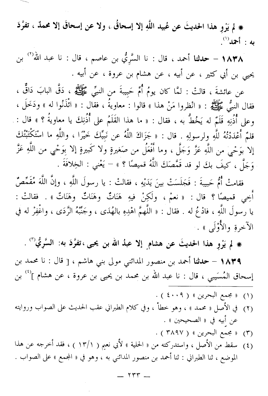 1838 - حَدَّثَنَا أَحْمَدُ قَالَ: نا السَّرِيُّ بْنُ عَاصِمٍ قَالَ: نا عَبْدُ اللَّهِ بْنُ يَحْيَى بْنِ أَبِي كَثِيرٍ، عَنْ أَبِيهِ، عَنْ هِشَامِ بْنِ عُرْوَةَ، عَنْ أَبِيهِ، عَنْ عَائِشَةَ قَالَتْ: لَمَّا كَانَ يَوْمُ أُمِّ حَبِيبَةَ مِنَ النَّبِيِّ صَلَّى اللهُ عَلَيْهِ وَسَلَّمَ، دَقَّ الْبَابَ دَاقٌّ، فَقَالَ النَّبِيُّ صَلَّى اللهُ عَلَيْهِ وَسَلَّمَ: «انْظُرُوا مَنْ هَذَا» قَالُوا: مُعَاوِيَةُ، فَقَالَ: «ائْذَنُوا لَهُ» وَدَخَلَ، وَعَلَى أُذُنِهِ قَلَمٌ لَهُ يَخْطُ بِهِ، فَقَالَ: «مَا هَذَا الْقَلَمُ عَلَى أُذُنِكَ يَا مُعَاوِيَةُ؟» قَالَ: قَلَمٌ أَعْدَدْتُهُ لِلَّهِ وَلِرَسُولِهِ. قَالَ: «§جَزَاكَ اللَّهُ عَنْ نَبِيَّكَ خَيْرًا، وَاللَّهِ مَا اسْتَكْتَبْتُكَ إِلَّا بِوَحْيٍ مِنَ اللَّهِ عَزَّ وَجَلَّ، وَمَا أَفْعَلُ مِنْ صَغِيرَةٍ وَلَا كَبِيرَةٍ إِلَّا بِوَحْيِ مِنَ اللَّهِ عَزَّ وَجَلَّ، كَيْفَ بِكَ لَوْ قَدْ قَمَّصَكَ اللَّهُ قَمِيصًا؟» يَعْنِي: الْخِلَافَةَ. فَقَامَتْ أُمُّ حَبِيبَةَ: فَجَلَسَتْ بَيْنَ يَدَيْهِ، فَقَالَتْ: يَا رَسُولَ اللَّهِ، وَإِنَّ اللَّهَ مُقَمِّصٌ أَخِي قَمِيصًا؟ قَالَ: «نَعَمْ، وَلَكِنْ فِيهِ هَنَاتٌ وَهَنَاتٌ وَهَنَاتٌ» . فَقَالَتْ: يَا رَسُولَ اللَّهِ، فَادْعُ لَهُ. فَقَالَ: «اللَّهُمَّ اهْدِهِ بِالْهُدَى، وَجَنِّبْهُ الرَّدَى، وَاغْفِرْ لَهُ فِي الْآخِرَةِ وَالْأُولَى»