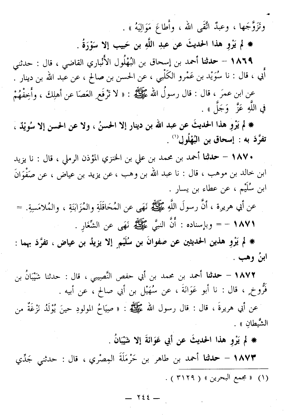 لَمْ يَرْوِ هَذَا الْحَدِيثَ عَنْ عَبْدِ اللَّهِ بْنِ دِينَارٍ إِلَّا الْحَسَنُ، وَلَا عَنِ الْحَسَنِ إِلَّا سُوَيْدٌ، تَفَرَّدَ بِهِ: إِسْحَاقُ بْنُ الْبُهْلُولِ "