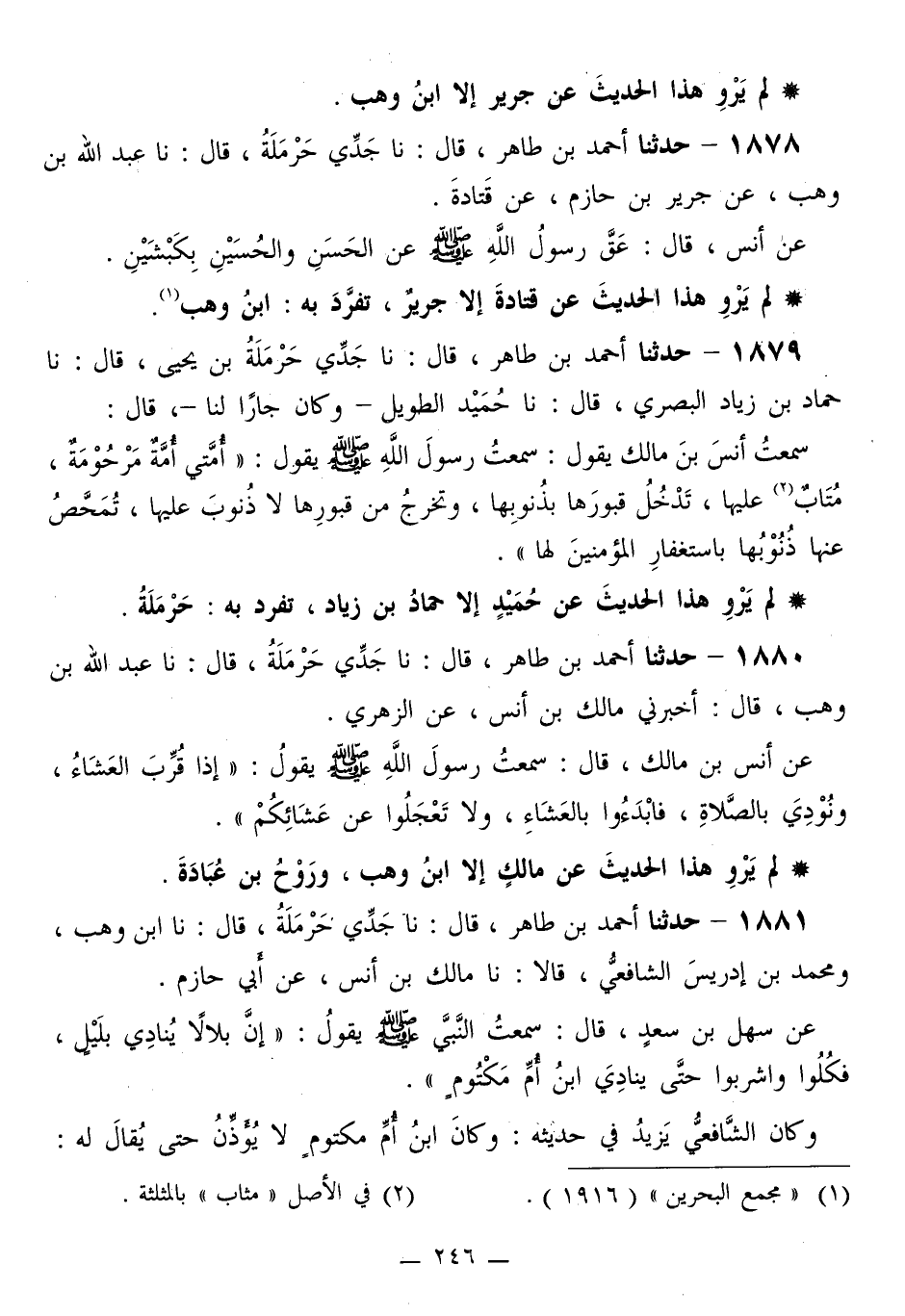 1879 - حَدَّثَنَا أَحْمَدُ بْنُ طَاهِرٍ قَالَ: نا جَدِّي حَرْمَلَةُ بْنُ يَحْيَى قَالَ: نا حَمَّادُ بْنُ زِيَادٍ الْبَصْرِيُّ قَالَ: نا حُمَيْدٌ الطَّوِيلُ، وَكَانَ جَارًا لَنَا قَالَ: سَمِعْتُ أَنَسَ بْنَ مَالِكٍ يَقُولُ: سَمِعْتُ رَسُولَ اللَّهِ صَلَّى اللهُ عَلَيْهِ وَسَلَّمَ يَقُولُ: «§أُمَّتِي أُمَّةٌ مَرْحُومَةٌ، مُتَابٌ عَلَيْهَا، تَدْخُلُ قُبُورَهَا بِذُنُوبِهَا، وَتَخْرُجُ مِنْ قُبُورِهَا لَا ذُنُوبَ عَلَيْهَا، تُمَحَّصُّ عَنْهَا ذُنُوبُهَا بِاسْتِغْفَارِ الْمُؤْمِنِينَ لَهَا»
