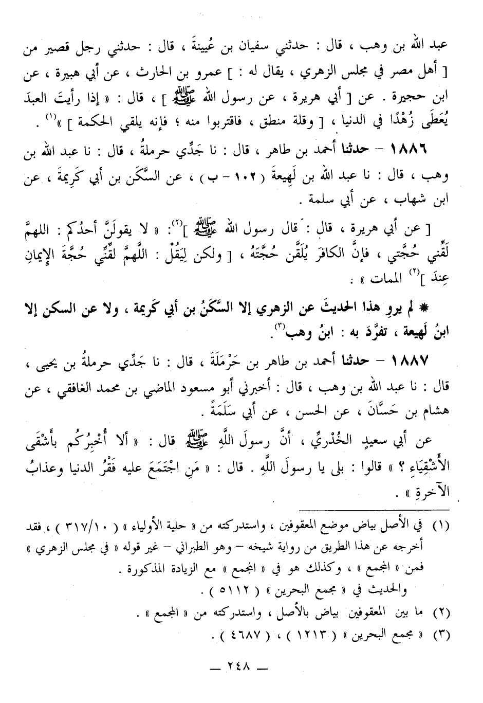 1887 - حَدَّثَنَا أَحْمَدُ بْنُ طَاهِرِ بْنِ حَرْمَلَةَ قَالَ: نا جَدِّي حَرْمَلَةُ بْنُ يَحْيَى قَالَ: نا عَبْدُ اللَّهِ بْنُ وَهْبٍ قَالَ: أَخْبَرَنِي أَبُو مَسْعُودٍ الْمَاضِي بْنُ مُحَمَّدٍ الْغَافِقِيُّ، عَنْ هِشَامِ بْنِ حَسَّانَ، عَنِ الْحَسَنِ، عَنْ أَبِي سَلَمَةَ، عَنْ أَبِي سَعِيدٍ الْخُدْرِيِّ، أَنَّ رَسُولَ اللَّهِ صَلَّى اللهُ عَلَيْهِ وَسَلَّمَ قَالَ: «أَلَا أُخْبِرُكُمْ بِأَشْقَى الْأَشْقِيَاءِ؟» قَالُوا: بَلَى يَا رَسُولَ اللَّهِ. قَالَ: «§مَنِ اجْتَمَعَ عَلَيْهِ فَقْرُ الدُّنْيَا وَعَذَابُ الْآخِرَةِ» -[249]- لَمْ يَرْوِ هَذَا الْحَدِيثَ عَنْ هِشَامِ بْنِ حَسَّانَ إِلَّا الْمَاضِي بْنُ مُحَمَّدٍ، تَفَرَّدَ بِهِ: ابْنُ وَهْبٍ "