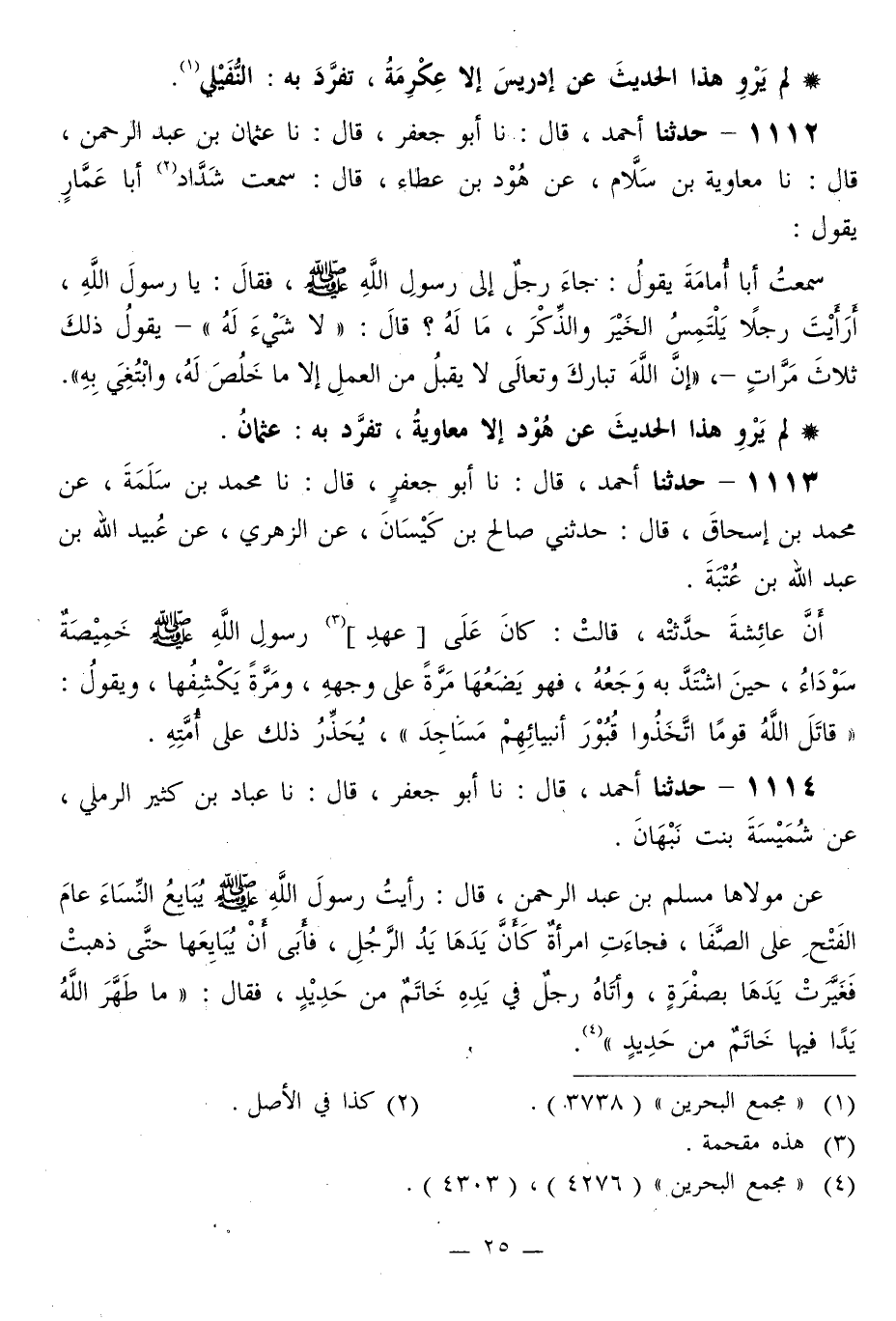 1114 - حَدَّثَنَا أَحْمَدُ قَالَ: نا أَبُو جَعْفَرٍ قَالَ: نا عَبَّادُ بْنُ كَثِيرٍ الرَّمْلِيُّ، عَنْ شُمَيْسَةَ بِنْتِ نَبْهَانَ، عَنْ مَوْلَاهَا مُسْلِمِ بْنِ عَبْدِ الرَّحْمَنِ قَالَ: رَأَيْتُ رَسُولَ اللَّهِ صَلَّى اللهُ عَلَيْهِ وَسَلَّمَ «يُبَايِعُ النِّسَاءَ عَامَ الْفَتْحِ عَلَى الصَّفَا، فَجَاءَتِ امْرَأَةٌ كَأَنَّ يَدِهَا يَدَ الرَّجُلِ، فَأَبَى أَنْ يُبَايِعَهَا حَتَّى ذَهَبَتْ فَغَيَّرَتْ يَدَهَا بِصُفْرَةٍ، وَأَتَاهُ رَجُلٌ فِي يَدِهِ خَاتَمٌ مِنْ حَدِيدٍ» ، فَقَالَ: «§مَا طَهَّرَ اللَّهُ يَدًا فِيهَا خَاتَمٌ مِنْ حَدِيدٍ»