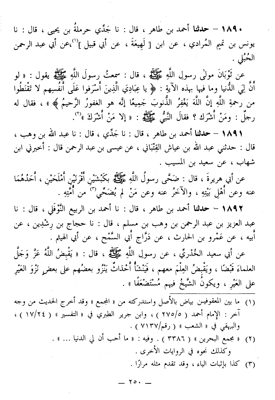 1890 - حَدَّثَنَا أَحْمَدُ بْنُ طَاهِرٍ قَالَ: نا جَدِّي حَرْمَلَةُ بْنُ يَحْيَى قَالَ: نا يُونُسُ بْنُ تَمِيمٍ الْمُرَادِيُّ، عَنِ ابْنِ لَهِيعَةَ، عَنْ أَبِي قَبِيلٍ، عَنْ أَبِي عَبْدِ الرَّحْمَنِ الْحُبُلِيِّ، عَنْ ثَوْبَانَ، مَوْلَى رَسُولِ اللَّهِ صَلَّى اللهُ عَلَيْهِ وَسَلَّمَ قَالَ: سَمِعْتُ رَسُولَ اللَّهِ صَلَّى اللهُ عَلَيْهِ وَسَلَّمَ يَقُولُ: «§لَوْ أَنَّ لِيَ الدُّنْيَا وَمَا فِيهَا بِهَذِهِ الْآيَةِ: {يَا عِبَادِيَ الَّذِينَ أَسْرَفُوا عَلَى أَنْفُسِهِمْ لَا تَقْنَطُوا مِنْ رَحْمَةِ اللَّهِ إِنَّ اللَّهَ يَغْفِرُ الذُّنُوبَ جَمِيعًا إِنَّهُ هُوَ الْغَفُورُ الرَّحِيمُ} [الزمر: 53] » ، فَقَالَ لَهُ رَجُلٌ: وَمَنْ أَشْرَكَ؟ فَقَالَ النَّبِيُّ صَلَّى اللهُ عَلَيْهِ وَسَلَّمَ: «إِلَّا مَنْ أَشْرَكَ»