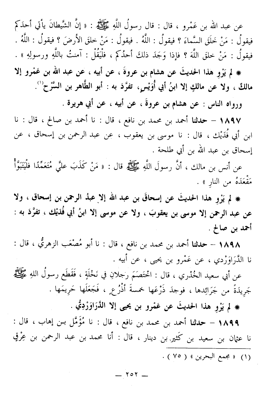 1897 - حَدَّثَنَا أَحْمَدُ بْنُ مُحَمَّدِ بْنِ نَافِعٍ قَالَ: نا أَحْمَدُ بْنُ صَالِحٍ قَالَ: نا ابْنُ أَبِي فُدَيْكٍ قَالَ: نا مُوسَى بْنُ يَعْقُوبَ، عَنْ عَبْدِ الرَّحْمَنِ بْنِ إِسْحَاقَ، عَنْ إِسْحَاقَ بْنِ عَبْدِ اللَّهِ بْنِ أَبِي طَلْحَةَ، عَنْ أَنَسِ بْنِ مَالِكٍ، أَنَّ رَسُولَ اللَّهِ صَلَّى اللهُ عَلَيْهِ وَسَلَّمَ قَالَ: «§مَنْ كَذَبَ عَلَيَّ مُتَعَمِّدًا فَلْيَتَبَوَّأْ مَقْعَدَهُ مِنَ النَّارِ»