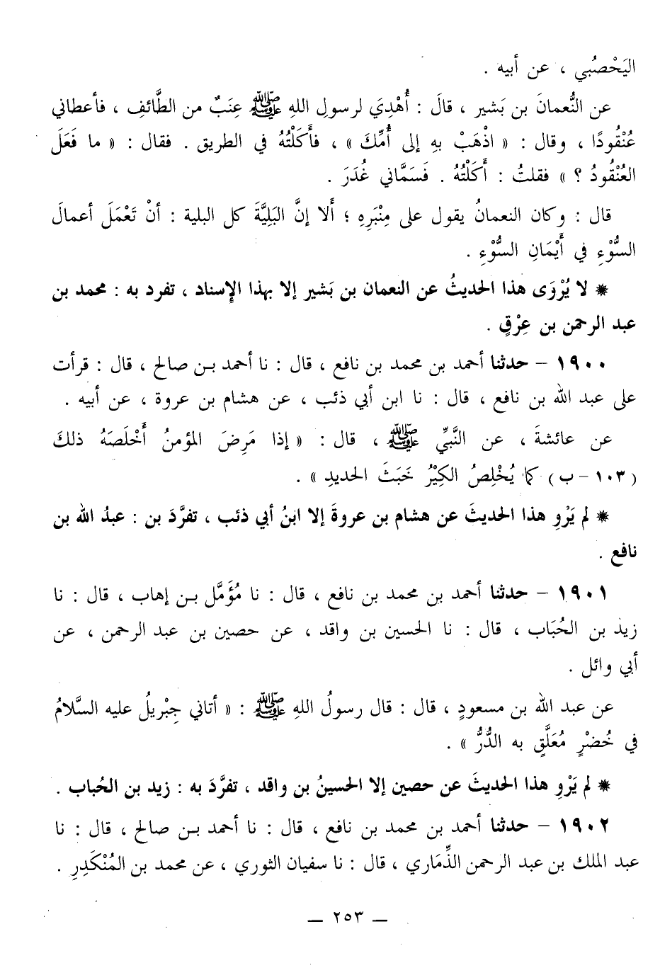 1901 - حَدَّثَنَا أَحْمَدُ بْنُ مُحَمَّدِ بْنِ نَافِعٍ قَالَ: نا مُؤَمَّلُ بْنُ إِهَابٍ قَالَ: نا زَيْدُ بْنُ الْحُبَابِ قَالَ: نا الْحُسَيْنُ بْنُ وَاقِدٍ، عَنْ حُصَيْنِ بْنِ عَبْدِ الرَّحْمَنِ، عَنْ أَبِي وَائِلٍ، عَنْ عَبْدِ اللَّهِ بْنِ مَسْعُودٍ قَالَ: قَالَ رَسُولُ اللَّهِ صَلَّى اللهُ عَلَيْهِ وَسَلَّمَ: «§أَتَانِي جِبْرِيلُ عَلَيْهِ السَّلَامُ فِي خُضْرٍ مُعَلَّقٍ بِهِ الدُّرُّ»
