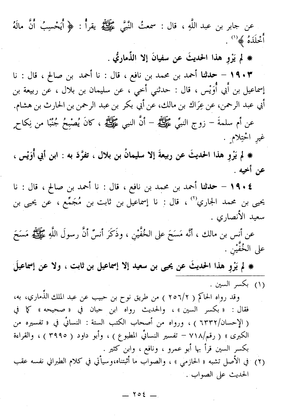 1904 - حَدَّثَنَا أَحْمَدُ بْنُ مُحَمَّدِ بْنِ نَافِعٍ قَالَ: نا أَحْمَدُ بْنُ صَالِحٍ قَالَ: نا يَحْيَى بْنُ مُحَمَّدٍ الْجَارِيُّ قَالَ: نا إِسْمَاعِيلُ بْنُ ثَابِتِ بْنِ مُجَمِّعٍ، عَنْ يَحْيَى بْنِ سَعِيدِ الْأَنْصَارِيِّ، عَنْ أَنَسِ بْنِ مَالِكٍ، «أَنَّهُ §مَسَحَ عَلَى الْخُفَّيْنِ»