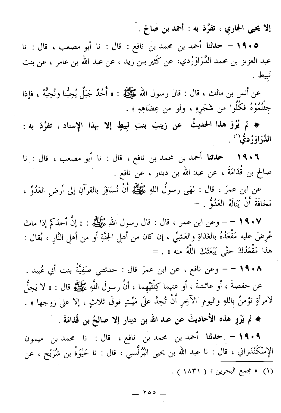 1905 - حَدَّثَنَا أَحْمَدُ بْنُ مُحَمَّدِ بْنِ نَافِعٍ قَالَ: نا أَبُو مُصْعَبٍ قَالَ: نا عَبْدُ الْعَزِيزِ بْنُ مُحَمَّدٍ الدَّرَاوَرْدِيُّ، عَنْ كَثِيرِ بْنِ زَيْدٍ، عَنْ عَبْدِ اللَّهِ بْنِ عَامِرٍ، عَنْ بِنْتِ نُبَيْطٍ، عَنْ أَنَسِ بْنِ مَالِكٍ قَالَ: قَالَ رَسُولُ اللَّهِ صَلَّى اللهُ عَلَيْهِ وَسَلَّمَ: «§أُحُدٌ جَبَلٌ يُحِبُّنَا وَنُحِبُّهُ، فَإِذَا جِئْتُمُوهُ فَكُلُوا مِنْ شَجَرِهِ، وَلَوْ مِنْ عِضَاهِهِ»