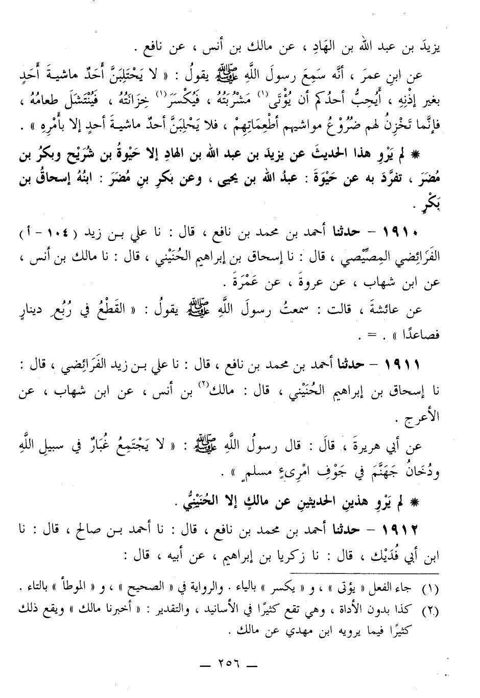 1911 - حَدَّثَنَا أَحْمَدُ بْنُ مُحَمَّدِ بْنِ نَافِعٍ قَالَ: نا عَلِيُّ بْنُ زَيْدٍ الْفَرَائِضِيُّ قَالَ: نا إِسْحَاقُ بْنُ إِبْرَاهِيمَ الْحُنَيْنِيُّ قَالَ: نا مَالِكُ بْنُ أَنَسٍ، عَنِ ابْنِ شِهَابٍ، عَنِ الْأَعْرَجِ، عَنْ أَبِي هُرَيْرَةَ قَالَ: قَالَ رَسُولُ اللَّهِ صَلَّى اللهُ عَلَيْهِ وَسَلَّمَ: «§لَا يَجْتَمِعُ غُبَارٌ فِي سَبِيلِ اللَّهِ وَدُخَانُ جَهَنَّمَ فِي جَوْفِ امْرِئٍ مُسْلِمٍ»