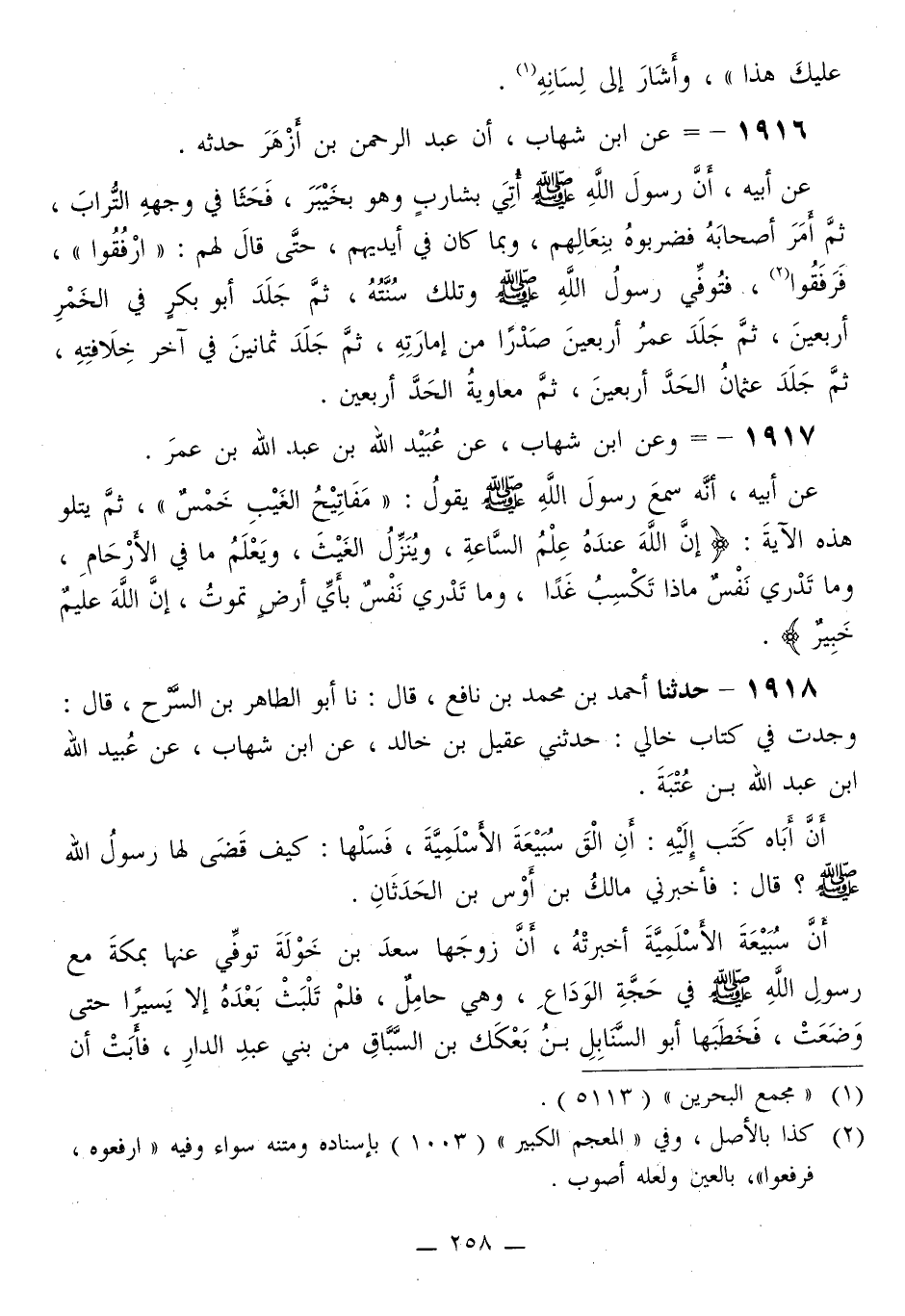 1918 - حَدَّثَنَا أَحْمَدُ بْنُ مُحَمَّدِ بْنِ نَافِعٍ قَالَ: نا أَبُو الطَّاهِرِ بْنُ السَّرْحِ قَالَ: وَجَدْتُ فِي كِتَابِ خَالِي: حَدَّثَنِي عُقَيْلُ بْنُ خَالِدٍ، عَنِ ابْنِ شِهَابٍ، عَنْ عُبَيْدِ اللَّهِ بْنِ عَبْدِ اللَّهِ بْنِ عُتْبَةَ، أَنَّ أَبَاهُ كَتَبَ إِلَيْهِ: أَنِ الْقَ سُبَيْعَةَ الْأَسْلَمِيَّةَ، فَسَلْهَا: كَيْفَ قَضَى لَهَا رَسُولُ اللَّهِ صَلَّى اللهُ عَلَيْهِ وَسَلَّمَ؟ قَالَ: فَأَخْبَرَنِي مَالِكُ بْنُ أَوْسِ بْنِ الْحَدَثَانِ، أَنَّ سُبَيْعَةَ الْأَسْلَمِيَّةَ أَخْبَرَتْهُ، أَنَّ زَوْجِهَا سَعْدَ بْنَ خَوْلَةَ تُوُفِّيَ عَنْهَا بِمَكَّةَ مَعَ رَسُولِ اللَّهِ صَلَّى اللهُ عَلَيْهِ وَسَلَّمَ فِي حَجَّةِ الْوَدَاعِ، وَهِيَ حَامِلٌ، فَلَمْ تَلْبَثْ بَعْدَهُ إِلَّا يَسِيرًا حَتَّى وَضَعَتْ، فَخَطَبَهَا أَبُو السَّنَابِلِ بْنُ بَعْكَكَ بْنِ السَّبَّاقِ مِنْ بَنِي عَبْدِ الدَّارِ، فَأَبَتْ أَنْ -[259]- تَنْكِحَهُ، فَقَالَ: أَمَا إِنَّكِ لَا تَحِلِّينَ حَتَّى تَعْتَدِّي آخِرَ الْأَجَلَيْنِ، «فَاسْتَفْتَتْ رَسُولَ اللَّهِ صَلَّى اللهُ عَلَيْهِ وَسَلَّمَ، §فَأَذِنَ لَهَا فِي النِّكَاحِ»