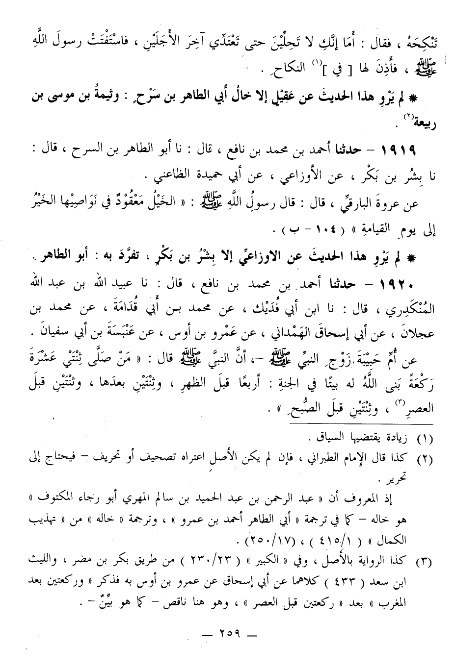 1919 - حَدَّثَنَا أَحْمَدُ بْنُ مُحَمَّدِ بْنِ نَافِعٍ قَالَ: نا أَبُو الطَّاهِرِ بْنُ السَّرْحِ قَالَ: نا بِشْرُ بْنُ بَكْرٍ، عَنِ الْأَوْزَاعِيِّ، عَنْ أَبِي حُمَيْدَةَ الظَّاعِنِيِّ، عَنْ عُرْوَةَ الْبَارِقِيِّ قَالَ: قَالَ رَسُولُ اللَّهِ صَلَّى اللهُ عَلَيْهِ وَسَلَّمَ: «§الْخَيْلُ مَعْقُودٌ فِي نَوَاصِيهَا الْخَيْرُ إِلَى يَوْمِ الْقِيَامَةِ»