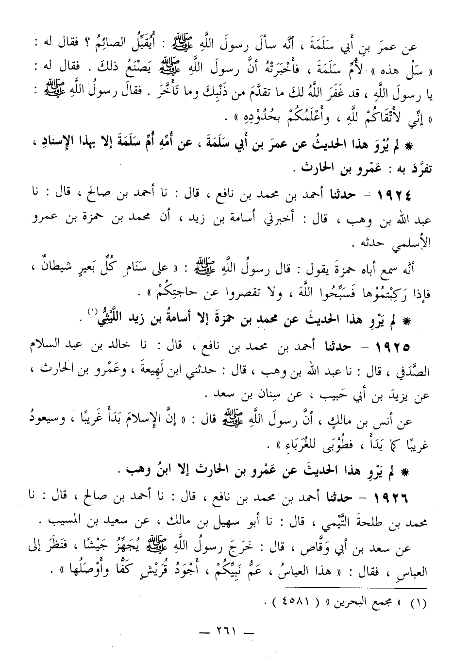 1925 - حَدَّثَنَا أَحْمَدُ بْنُ مُحَمَّدِ بْنِ نَافِعٍ قَالَ: نا خَالِدُ بْنُ عَبْدِ السَّلَامِ الصَّدَفِيُّ قَالَ: نا عَبْدُ اللَّهِ بْنُ وَهْبٍ قَالَ: حَدَّثَنِي ابْنُ لَهِيعَةَ، وَعَمْرُو بْنُ الْحَارِثِ، عَنْ يَزِيدَ بْنِ أَبِي حَبِيبٍ، عَنْ سِنَانِ بْنِ سَعْدٍ، عَنْ أَنَسِ بْنِ مَالِكٍ، أَنَّ رَسُولَ اللَّهِ صَلَّى اللهُ عَلَيْهِ وَسَلَّمَ قَالَ: «إِنَّ §الْإِسْلَامَ بَدَأَ غَرِيبًا، وَسَيَعُودُ غَرِيبًا كَمَا بَدَأَ، فَطُوبَى لِلْغُرَبَاءِ»