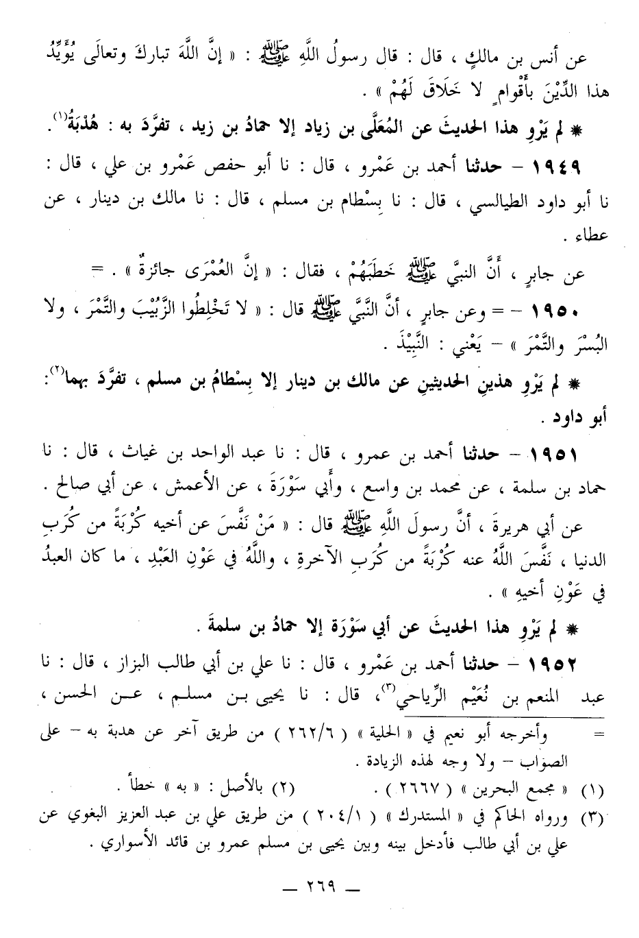 1950 - وَعَنْ جَابِرٍ، أَنَّ النَّبِيَّ صَلَّى اللهُ عَلَيْهِ وَسَلَّمَ قَالَ: «§لَا تَخْلِطُوا الزَّبِيبَ وَالتَّمْرَ، وَلَا الْبُسْرَ وَالتَّمْرَ» يَعْنِي: النَّبِيذَ «لَوْ يَرْوِ هَذَيْنِ الْحَدِيثَيْنِ عَنْ مَالِكِ بْنِ دِينَارٍ إِلَّا بِسْطَامُ بْنُ مُسْلِمٍ، تَفَرَّدَ بِهِمَا: أَبُو دَاوُدَ»