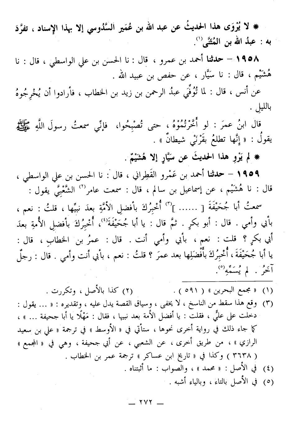 1959 - حَدَّثَنَا أَحْمَدُ بْنُ عَمْرٍو الْقَطِرَانِيُّ قَالَ: نا الْحَسَنُ بْنُ عَلِيٍّ الْوَاسِطِيُّ قَالَ: نا هُشَيْمٌ، عَنْ إِسْمَاعِيلَ بْنِ سَالِمٍ قَالَ: سَمِعْتُ عَامِرًا الشَّعْبِيَّ يَقُولُ: سَمِعْتُ أَبَا جُحَيْفَةَ يَقُولُ: دَخَلْتُ عَلَى عَلِيٍّ فَقُلْتُ: يَا أَفْضَلَ الْأُمَّةِ بَعْدَ نَبِيِّهَا، فَقَالَ: «مَهْلًا يَا أَبَا جُحَيْفَةَ أُخْبِرُكَ §بِأَفْضَلِ الْأُمَّةِ، بَعْدَ نَبِيَّهَا؟» قُلْتُ: نَعَمْ، بِأَبِي وَأُمِّي. قَالَ: «أَبُو بَكْرٍ، ثُمَّ قَالَ يَا أَبَا جُحَيْفَةَ، أُخْبِرُكَ بِأَفْضَلِ الْأُمَّةِ بَعْدَ أَبِي بَكْرٍ؟» قُلْتُ: نَعَمْ، بِأَبِي وَأُمِّي أَنْتَ. قَالَ: «عُمَرُ بْنُ الْخَطَّابِ» قَالَ: «يَا أَبَا جُحَيْفَةَ، أُخْبِرُكَ بِأَفْضَلِهَا بَعْدَ عُمَرَ؟» قُلْتُ: نَعَمْ، بِأَبِي وَأُمِّي. قَالَ: «رَجُلٌ آخَرُ. لَمْ يُسَمِّهِ» -[273]- لَمْ يَرْوِ هَذَا الْحَدِيثَ عَنْ إِسْمَاعِيلَ بْنِ سَالِمٍ إِلَّا هُشَيْمٌ، تَفَرَّدَ بِهِ: الْحَسَنُ بْنُ عَلِيٍّ "