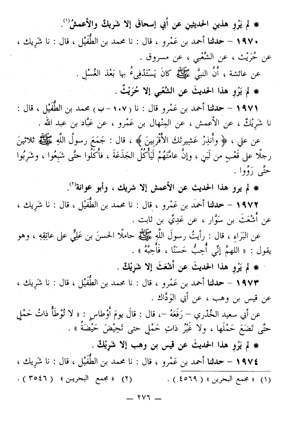 1972 - حَدَّثَنَا أَحْمَدُ بْنُ عَمْرٍو قَالَ: نا مُحَمَّدُ بْنُ الطُّفَيْلِ قَالَ: نا شَرِيكٌ، عَنْ أَشْعَثَ بْنِ سَوَّارٍ، عَنْ عَدِيِّ بْنِ ثَابِتٍ، عَنِ الْبَرَاءِ قَالَ: رَأَيْتُ رَسُولَ اللَّهِ صَلَّى اللهُ عَلَيْهِ وَسَلَّمَ حَامِلًا الْحَسَنَ بْنَ عَلِيٍّ عَلَى عَاتِقِهِ، وَهُوَ يَقُولُ: «§اللَّهُمَّ إِنِّي أُحِبُّ حَسَنًا، فَأَحِبَّهُ»