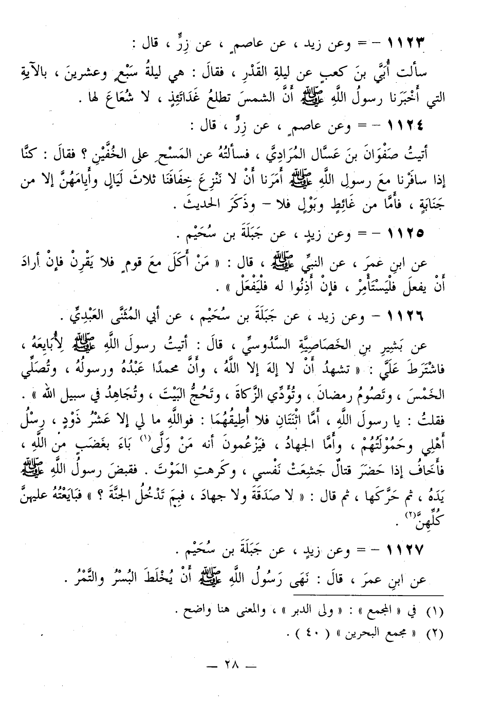 1123 - وَعَنْ زَيْدٍ، عَنْ عَاصِمٍ، عَنْ زِرٍّ قَالَ: سَأَلْتُ أُبَيَّ بْنَ كَعْبٍ، عَنْ §لَيْلَةِ الْقَدْرِ، فَقَالَ: هِيَ لَيْلَةُ سَبْعٍ وَعِشْرِينَ، بِالْآيَةِ الَّتِي أَخْبَرَنَا رَسُولُ اللَّهِ صَلَّى اللهُ عَلَيْهِ وَسَلَّمَ «أَنَّ الشَّمْسَ تَطْلُعُ غَدَاتَئِذٍ، لَا شُعَاعَ لَهَا»