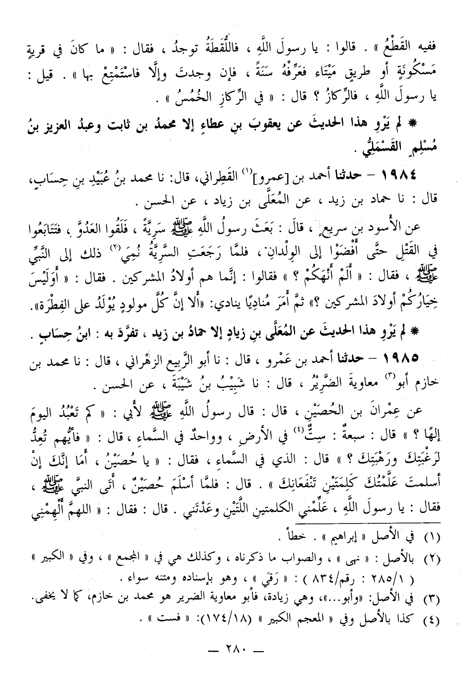 1985 - حَدَّثَنَا أَحْمَدُ بْنُ عَمْرٍو قَالَ: نا أَبُو الرَّبِيعِ الزَّهْرَانِيُّ قَالَ: نا مُحَمَّدُ بْنُ خَازِمٍ أَبُو مُعَاوِيَةَ الضَّرِيرُ قَالَ: نا شَبِيبُ بْنُ شَيْبَةَ، عَنِ الْحَسَنِ، عَنْ عِمْرَانَ بْنِ الْحُصَيْنِ قَالَ: قَالَ رَسُولُ اللَّهِ صَلَّى اللهُ عَلَيْهِ وَسَلَّمَ لِأَبِي: «كَمْ تَعْبُدُ الْيَوْمَ إِلَهًا؟» قَالَ: سَبْعَةً، سِتٌّ فِي الْأَرْضِ، وَوَاحِدٌ فِي السَّمَاءِ قَالَ: «فَأَيُّهُمْ تَعُدُّ لِرَغْبَتِكَ وَرَهْبَتِكَ؟» قَالَ: الَّذِي فِي السَّمَاءِ، فَقَالَ: «يَا حُصَيْنُ، أَمَا إِنَّكَ إِنْ أَسْلَمْتَ عَلَّمْتُكَ كَلِمَتَيْنِ تَنْفَعَانِكَ» . قَالَ: فَلَمَّا أَسْلَمَ حُصَيْنٌ، أَتَى النَّبِيَّ صَلَّى اللهُ عَلَيْهِ وَسَلَّمَ، فَقَالَ: يَا رَسُولَ اللَّهِ، عَلِّمْنِي الْكَلِمَتَيْنِ اللَّتَيْنِ وَعَدْتَنِي. قَالَ: فَقَالَ: «§اللَّهُمَّ أَلْهِمْنِي -[281]- رُشْدِي، وَأَعِذْنِي مِنْ شَرِّ نَفْسِي»