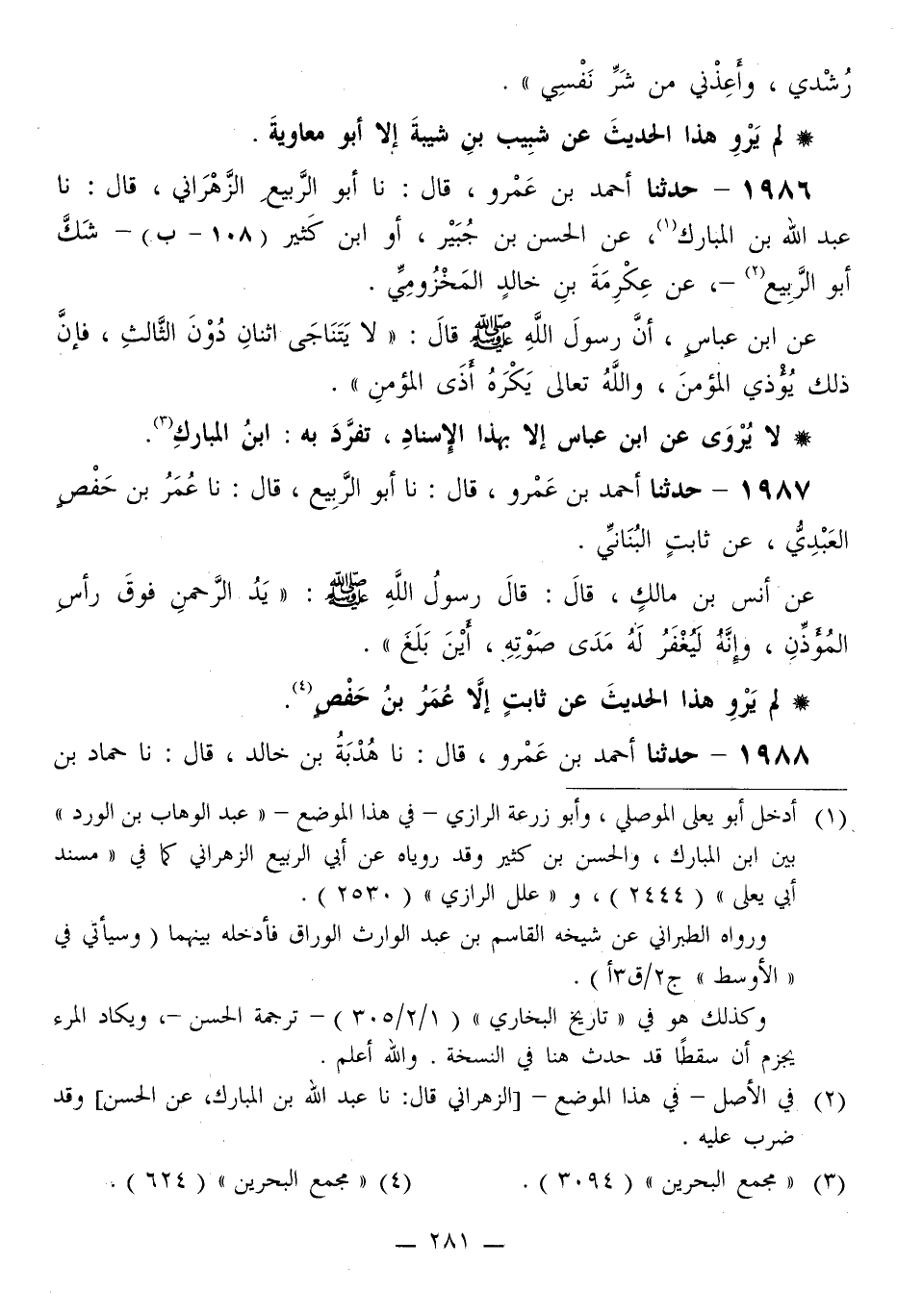 1986 - حَدَّثَنَا أَحْمَدُ بْنُ عَمْرٍو قَالَ: نا أَبُو الرَّبِيعِ الزَّهْرَانِيُّ قَالَ: نا عَبْدُ اللَّهِ بْنُ الْمُبَارَكِ، عَنِ الْحَسَنِ بْنِ جُبَيْرٍ، أَوِ ابْنِ كَثِيرٍ، شَكَّ أَبُو الرَّبِيعِ، عَنْ عِكْرِمَةَ بْنِ خَالِدٍ الْمَخْزُومِيِّ، عَنِ ابْنِ عَبَّاسٍ، أَنَّ رَسُولَ اللَّهِ صَلَّى اللهُ عَلَيْهِ وَسَلَّمَ قَالَ: «§لَا يَتَنَاجَى اثْنَانِ دُونَ الثَّالِثِ، فَإِنَّ ذَلِكَ يُؤْذِي الْمُؤْمِنَ، وَاللَّهُ تَعَالَى يَكْرَهُ أَذَى الْمُؤْمِنِ»