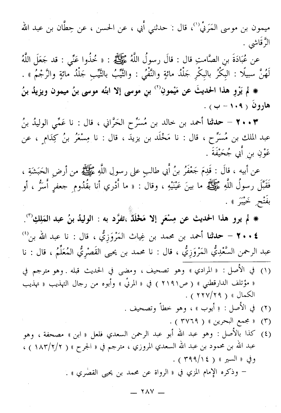 2003 - حَدَّثَنَا أَحْمَدُ بْنُ خَالِدِ بْنِ مُسَرِّحٍ الْحَرَّانِيُّ قَالَ: نا عَمِّي الْوَلِيدُ بْنُ عَبْدِ الْمَلِكِ بْنِ مُسَرِّحٍ قَالَ: نا مَخْلَدُ بْنُ يَزِيدَ قَالَ: نا مِسْعَرُ بْنُ كِدَامٍ، عَنْ عَوْنِ بْنِ أَبِي جُحَيْفَةَ، عَنْ أَبِيهِ قَالَ: قَدِمَ جَعْفَرُ بْنُ أَبِي طَالِبٍ عَلَى رَسُولِ اللَّهِ صَلَّى اللهُ عَلَيْهِ وَسَلَّمَ مِنْ أَرْضِ الْحَبَشَةِ، فَقَبَّلَ رَسُولُ اللَّهِ صَلَّى اللهُ عَلَيْهِ وَسَلَّمَ مَا بَيْنَ عَيْنَيْهِ، وَقَالَ: «§مَا أَدْرِي أَنَا بِقُدُومِ جَعْفَرٍ أَسَرُّ، أَوْ بِفَتْحِ خَيْبَرَ»