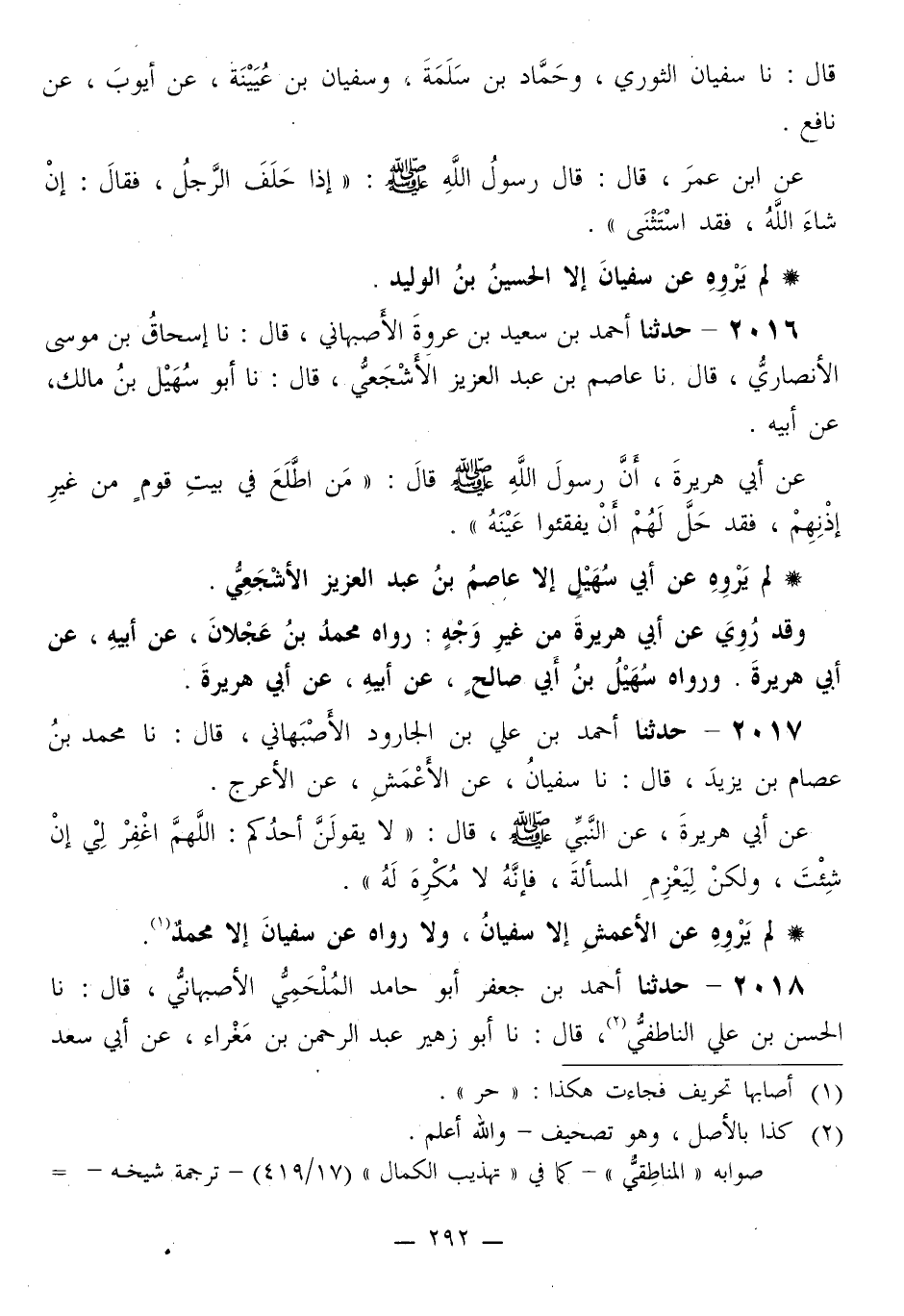 2017 - حَدَّثَنَا أَحْمَدُ بْنُ عَلِيِّ بْنِ الْجَارُودِ الْأَصْبَهَانِيُّ قَالَ: نا مُحَمَّدُ بْنُ عِصَامِ بْنِ يَزِيدَ قَالَ: نا سُفْيَانُ، عَنِ الْأَعْمَشِ، عَنِ الْأَعْرَجِ، عَنْ أَبِي هُرَيْرَةَ، عَنِ النَّبِيِّ صَلَّى اللهُ عَلَيْهِ وَسَلَّمَ قَالَ: «§لَا يَقُولَنَّ أَحَدُكُمْ: اللَّهُمَّ اغْفِرْ لِي إِنْ شِئْتَ، وَلَكِنْ لِيَعْزِمِ الْمَسْأَلَةَ، فَإِنَّهُ لَا مُكْرِهَ لَهُ»