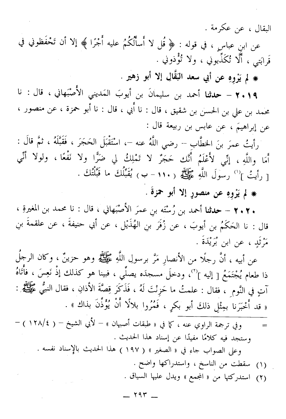 2019 - حَدَّثَنَا أَحْمَدُ بْنُ سُلَيْمَانَ بْنِ أَيُّوبَ الْمَدِينِيُّ الْأَصْبَهَانِيُّ قَالَ: نا مُحَمَّدُ بْنُ عَلِيِّ بْنِ الْحَسَنِ بْنِ شَقِيقٍ قَالَ: نا أَبِي قَالَ: نا أَبُو حَمْزَةَ، عَنْ مَنْصُورٍ، عَنْ إِبْرَاهِيمَ، عَنْ عَابِسِ بْنِ رَبِيعَةَ قَالَ: رَأَيْتُ عُمَرَ بْنَ الْخَطَّابِ رَضِي اللَّهُ عَنْهُ، اسْتَقْبَلَ الْحَجَرَ، فَقَبَّلَهُ، ثُمَّ قَالَ: «أَمَا وَاللَّهِ، إِنِّي لَأَعْلَمُ أَنَّكَ حَجَرٌ لَا تَمْلِكُ لِي ضَرًّا وَلَا نَفْعًا، §وَلَوْلَا أَنِّي رَأَيْتُ رَسُولَ اللَّهِ صَلَّى اللهُ عَلَيْهِ وَسَلَّمَ يُقَبِّلُكَ مَا قَبَّلْتُكَ»