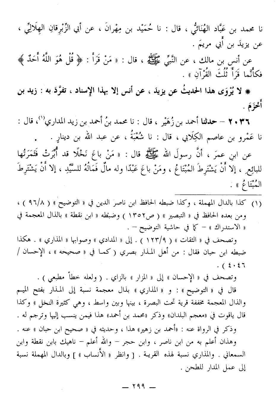 2036 - حَدَّثَنَا أَحْمَدُ بْنُ زُهَيْرٍ قَالَ: نا مُحَمَّدُ بْنُ أَحْمَدَ بْنِ زَبْدَا الْمَذَارِيُّ قَالَ: نا عَمْرُو بْنُ عَاصِمٍ الْكِلَابِيُّ قَالَ: نا شُعْبَةُ، عَنْ عَبْدِ اللَّهِ بْنِ دِينَارٍ، عَنِ ابْنِ عُمَرَ، أَنَّ رَسُولَ اللَّهِ صَلَّى اللهُ عَلَيْهِ وَسَلَّمَ قَالَ: «§مَنْ بَاعَ نَخْلًا قَدْ أُبِّرَتْ فَثَمَرَتُهَا لِلْبَائِعِ، إِلَّا أَنْ يَشْتَرِطَ الْمُبْتَاعُ، وَمَنْ بَاعَ عَبْدًا وَلَهُ مَالٌ فَمَالُهُ لِلسَّيِّدِ، إِلَّا أَنْ يَشْتَرِطَ الْمُبْتَاعُ»