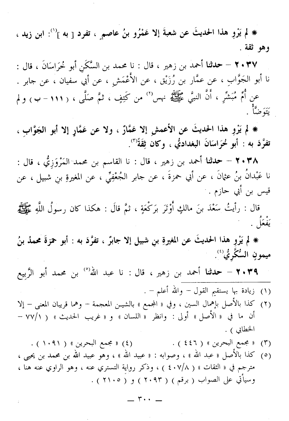 2037 - حَدَّثَنَا أَحْمَدُ بْنُ زُهَيْرٍ قَالَ: نا مُحَمَّدُ بْنُ السَّكَنِ أَبُو خُرَاسَانَ قَالَ: نا أَبُو الْجَوَّابِ، عَنْ عَمَّارِ بْنِ رُزَيْقٍ، عَنِ الْأَعْمَشِ، عَنْ أَبِي سُفْيَانَ، عَنْ جَابِرٍ، عَنْ أُمِّ مُبَشِّرٍ، «أَنَّ النَّبِيَّ صَلَّى اللهُ عَلَيْهِ وَسَلَّمَ §نَهَسَ مِنْ كَتِفٍ، ثُمَّ صَلَّى، وَلَمْ يَتَوَضَّأْ»