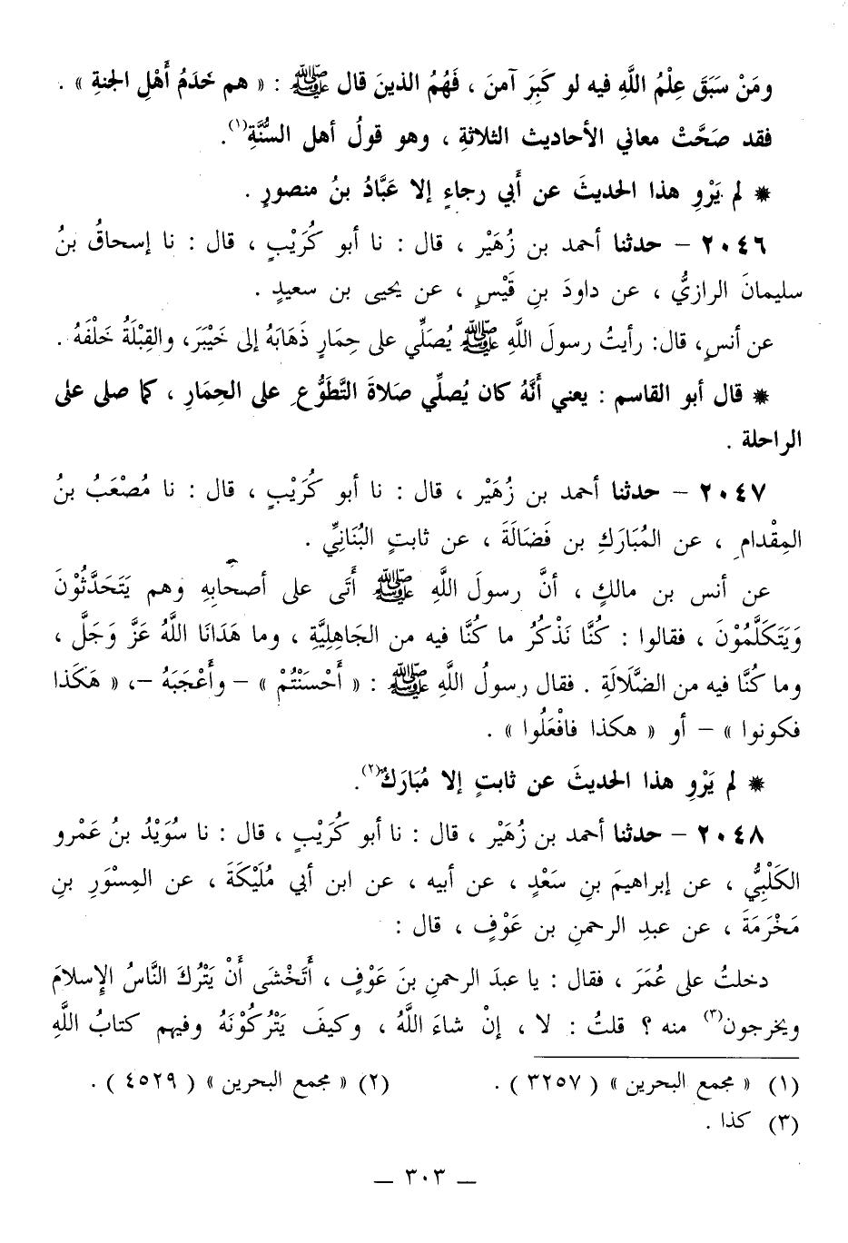 2047 - حَدَّثَنَا أَحْمَدُ بْنُ زُهَيْرٍ قَالَ: نا أَبُو كُرَيْبٍ قَالَ: نا مُصْعَبُ بْنُ الْمِقْدَامِ، عَنِ الْمُبَارَكِ بْنِ فَضَالَةَ، عَنْ ثَابِتٍ الْبُنَانِيِّ، عَنْ أَنَسِ بْنِ مَالِكٍ، أَنَّ رَسُولَ اللَّهِ صَلَّى اللهُ عَلَيْهِ وَسَلَّمَ أَتَى عَلَى أَصْحَابِهِ وَهُمْ يَتَحَدَّثُونَ وَيَتَكَلَّمُونَ، فَقَالُوا: كُنَّا نَذْكُرُ مَا كُنَّا فِيهِ مِنَ الْجَاهِلِيَّةِ، وَمَا هَدَانَا اللَّهُ عَزَّ وَجَلَّ، وَمَا كُنَّا فِيهِ مِنَ الضَّلَالَةِ. فَقَالَ رَسُولُ اللَّهِ صَلَّى اللهُ عَلَيْهِ وَسَلَّمَ: «§أَحْسَنْتُمْ» وَأَعْجَبَهُ، «هَكَذَا فَكُونُوا» أَوْ «هَكَذَا فَافْعَلُوا»