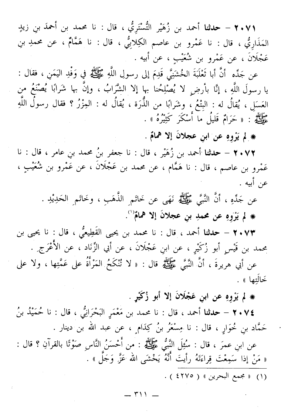 2071 - حَدَّثَنَا أَحْمَدُ بْنُ زُهَيْرٍ التُّسْتَرِيُّ قَالَ: نا مُحَمَّدُ بْنُ أَحْمَدَ بْنِ زَبْدَا الْمَذَارِيُّ قَالَ: نا عَمْرُو بْنُ عَاصِمٍ الْكِلَابِيُّ قَالَ: نا هَمَّامٌ، عَنْ مُحَمَّدِ بْنِ عَجْلَانَ، عَنْ عَمْرِو بْنِ شُعَيْبٍ، عَنْ أَبِيهِ، عَنْ جَدِّهِ، أَنَّ أَبَا ثَعْلَبَةَ الْخُشَنِيَّ، قَدِمَ إِلَى رَسُولِ اللَّهِ صَلَّى اللهُ عَلَيْهِ وَسَلَّمَ فِي وَفْدِ الْيَمَنِ، فَقَالَ: يَا رَسُولَ اللَّهِ، إِنَّا بِأَرْضٍ لَا يُصْلِحُنَا بِهَا إِلَّا الشَّرَابُ، وَإِنَّ بِهَا شَرَابًا يُصْنَعُ مِنَ الْعَسَلِ، يُقَالُ لَهُ: الْبِتْعُ، وَشَرَابًا مِنَ الذُّرَةِ، يُقَالُ لَهُ: الْمِزْرُ؟ فَقَالَ رَسُولُ اللَّهِ صَلَّى اللهُ عَلَيْهِ وَسَلَّمَ: «§حَرَامٌ قَلِيلُ مَا أَسْكَرَ كَثِيرُهُ»