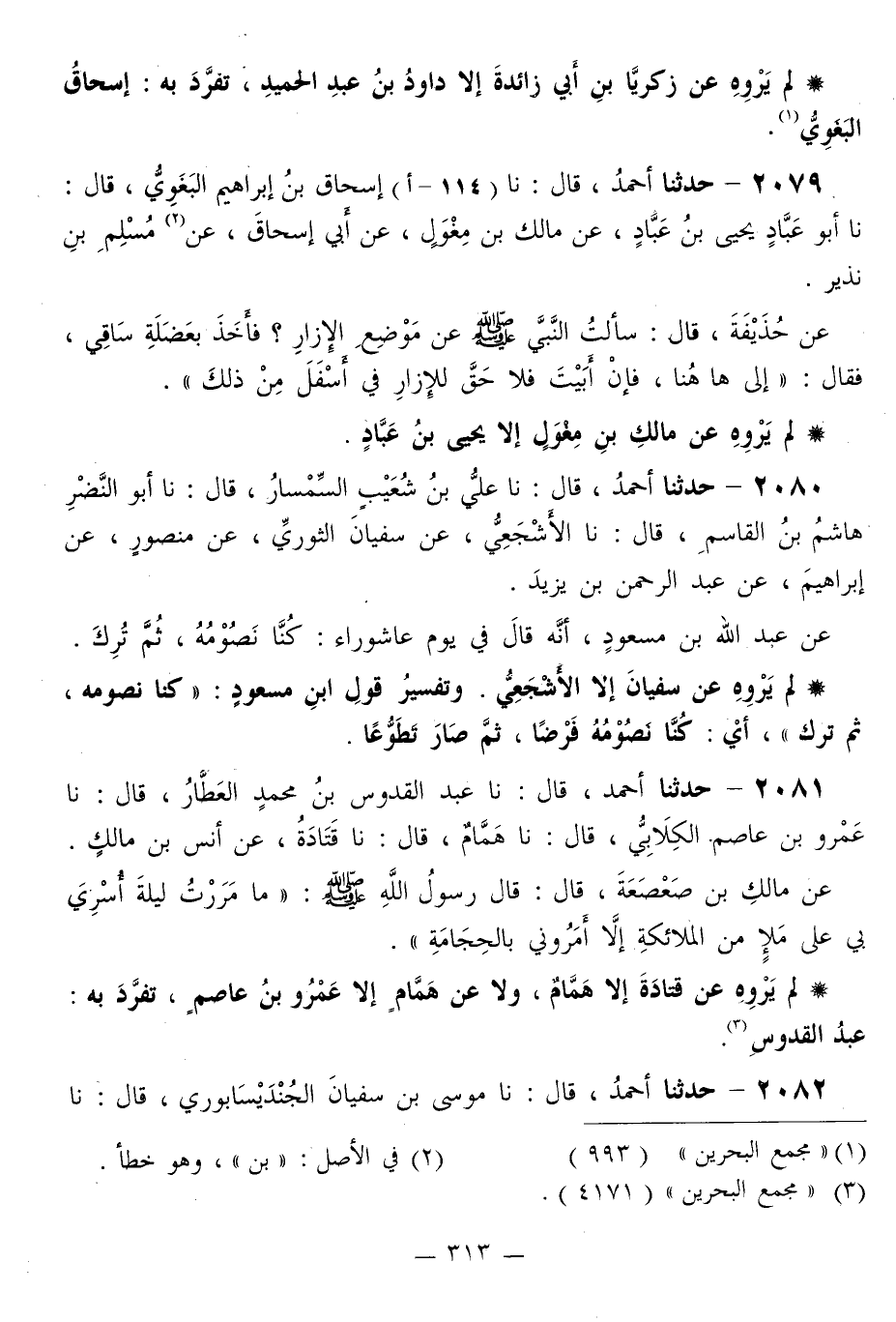 2079 - حَدَّثَنَا أَحْمَدُ قَالَ: نا إِسْحَاقُ بْنُ إِبْرَاهِيمَ الْبَغَوِيُّ قَالَ: نا أَبُو عَبَّادٍ يَحْيَى بْنُ عَبَّادٍ، عَنْ مَالِكِ بْنِ مِغْوَلٍ، عَنْ أَبِي إِسْحَاقَ، عَنْ مُسْلِمِ بْنِ نَذِيرٍ، عَنْ حُذَيْفَةَ قَالَ: سَأَلْتُ النَّبِيَّ صَلَّى اللهُ عَلَيْهِ وَسَلَّمَ عَنْ مَوْضِعِ الْإِزَارِ؟ فَأَخَذَ بِعَضَلَةِ سَاقِي، فَقَالَ: «§إِلَى هَا هُنَا، فَإِنْ أَبَيْبَ فَلَا حَقَّ لِلْإِزَارِ فِي أَسْفَلَ مِنْ ذَلِكَ»