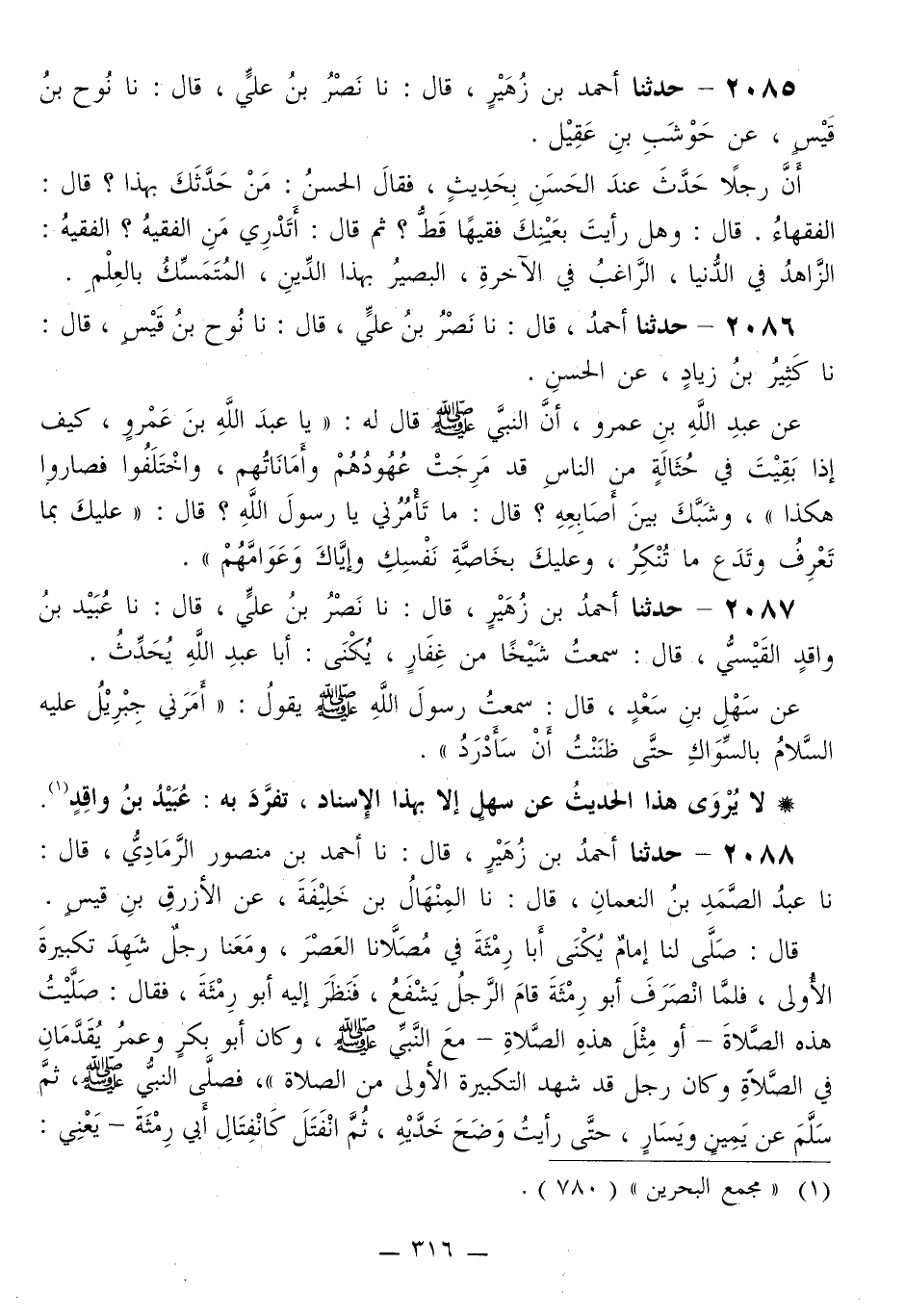 2086 - حَدَّثَنَا أَحْمَدُ قَالَ: نا نَصْرُ بْنُ عَلِيٍّ قَالَ: نا نُوحُ بْنُ قَيْسٍ قَالَ: نا كَثِيرُ بْنُ زِيَادٍ، عَنِ الْحَسَنِ، عَنْ عَبْدِ اللَّهِ بْنِ عَمْرٍو، أَنَّ النَّبِيَّ صَلَّى اللهُ عَلَيْهِ وَسَلَّمَ قَالَ لَهُ: «يَا عَبْدَ اللَّهِ بْنَ عَمْرٍو، كَيْفَ إِذَا بَقِيتَ فِي حُثَالَةٍ مِنَ النَّاسِ قَدْ مَرِجَتْ عُهُودُهُمْ وَأَمَانَاتُهُمْ، وَاخْتَلَفُوا فَصَارُوا هَكَذَا» ، وَشَبَّكَ بَيْنَ أَصَابِعِهِ؟ قَالَ: مَا تَأْمُرُنِي يَا رَسُولَ اللَّهِ؟ قَالَ: «§عَلَيْكَ بِمَا تَعْرِفُ، وَتَدَعُ مَا تُنْكِرُ، وَعَلَيْكَ بِخَاصَّةِ نَفْسِكَ، وَإِيَّاكَ وَعَوَامَّهُمْ»
