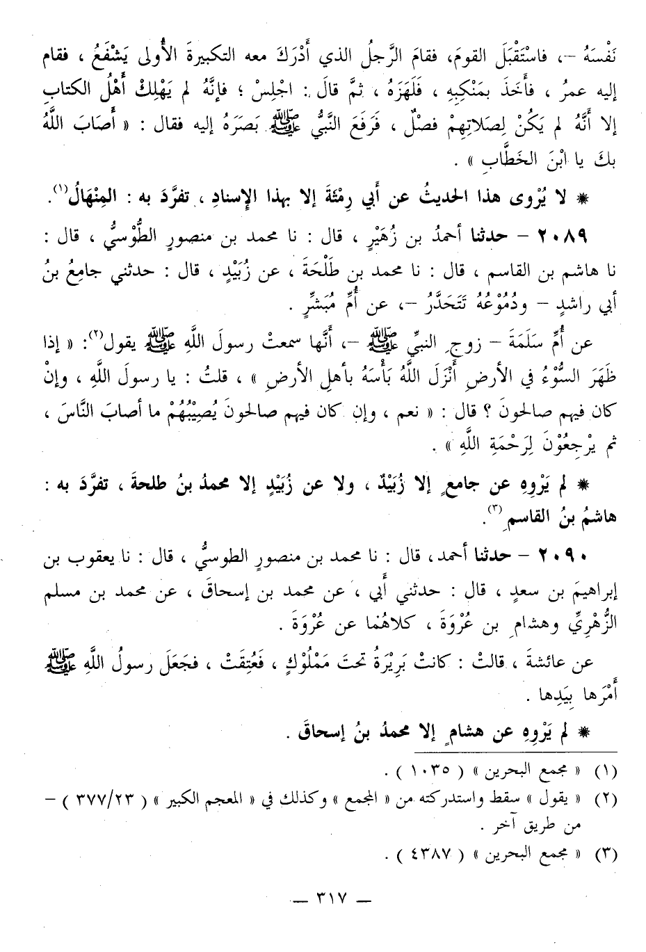 2089 - حَدَّثَنَا أَحْمَدُ بْنُ زُهَيْرٍ قَالَ: نا مُحَمَّدُ بْنُ مَنْصُورٍ الطُّوسِيُّ قَالَ: نا هَاشِمُ بْنُ الْقَاسِمِ قَالَ: نا مُحَمَّدُ بْنُ طَلْحَةَ، عَنْ زُبَيْدٍ قَالَ: حَدَّثَنِي جَامِعُ بْنُ أَبِي رَاشِدٍ، وَدُمُوعُهُ تَتَحَدَّرُ، عَنْ أُمِّ مُبَشِّرٍ، عَنْ أُمِّ سَلَمَةَ زَوْجِ النَّبِيِّ صَلَّى اللهُ عَلَيْهِ وَسَلَّمَ، أَنَّهَا سَمِعَتْ رَسُولَ اللَّهِ صَلَّى اللهُ عَلَيْهِ وَسَلَّمَ يَقُولُ: «§إِذَا ظَهَرَ السُّوءُ فِي الْأَرْضِ أَنْزَلَ اللَّهُ بَأْسَهُ بِأَهْلِ الْأَرْضِ» ، قُلْتُ: يَا رَسُولَ اللَّهِ، وَإِنْ كَانَ فِيهِمْ صَالِحُونَ؟ قَالَ: «نَعَمْ وَإِنْ كَانَ فِيهِم صَالِحُونَ، يُصِيبُهُمْ مَا أَصَابَ النَّاسُ، ثُمَّ يَرْجِعُونَ لِرَحَمَةِ اللَّهِ»
