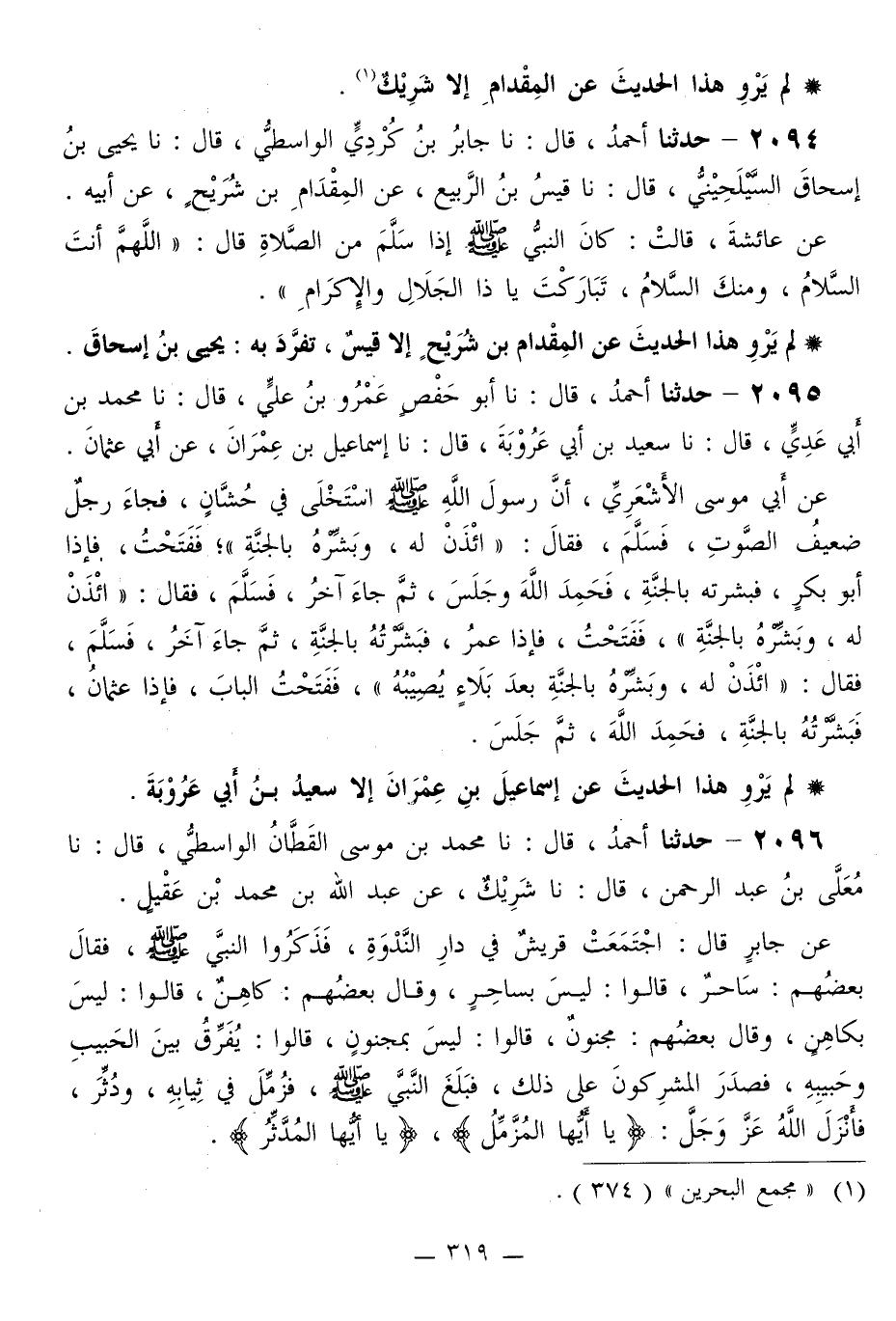 2096 - حَدَّثَنَا أَحْمَدُ قَالَ: نا مُحَمَّدُ بْنُ مُوسَى الْقَطَّانُ الْوَاسِطِيُّ قَالَ: نا مُعَلَّى بْنُ عَبْدِ الرَّحْمَنِ قَالَ: نا شَرِيكٌ، عَنْ عَبْدِ اللَّهِ بْنِ مُحَمَّدِ بْنِ عَقِيلٍ، عَنْ جَابِرٍ قَالَ: «اجْتَمَعَتْ قُرَيْشٌ فِي دَارِ النَّدْوَةِ، فَذَكَرُوا النَّبِيَّ صَلَّى اللهُ عَلَيْهِ وَسَلَّمَ، فَقَالَ بَعْضُهُمْ: سَاحِرٌ، قَالُوا: لَيْسَ بِسَاحِرٍ، وَقَالَ بَعْضُهُمْ: كَاهِنٌ، قَالُوا: لَيْسَ بِكَاهِنٍ، وَقَالَ بَعْضُهُمْ: مَجْنُونٌ، قَالُوا: لَيْسَ بِمَجْنُونٍ، قَالُوا: يُفَرِّقُ بَيْنَ الْحَبِيبِ وَحَبِيبِهِ، فَصَدَرَ الْمُشْرِكُونَ عَلَى ذَلِكَ، فَبَلَغَ النَّبِيَّ صَلَّى اللهُ عَلَيْهِ وَسَلَّمَ، فَزُمِّلَ فِي ثِيَابِهِ، وَدُثِّرَ، فَأَنْزَلَ اللَّهُ عَزَّ وَجَلَّ: §يَا أَيُّهَا الْمُزَّمِّلُ، يَا أَيُّهَا الْمُدَّثِّرُ»