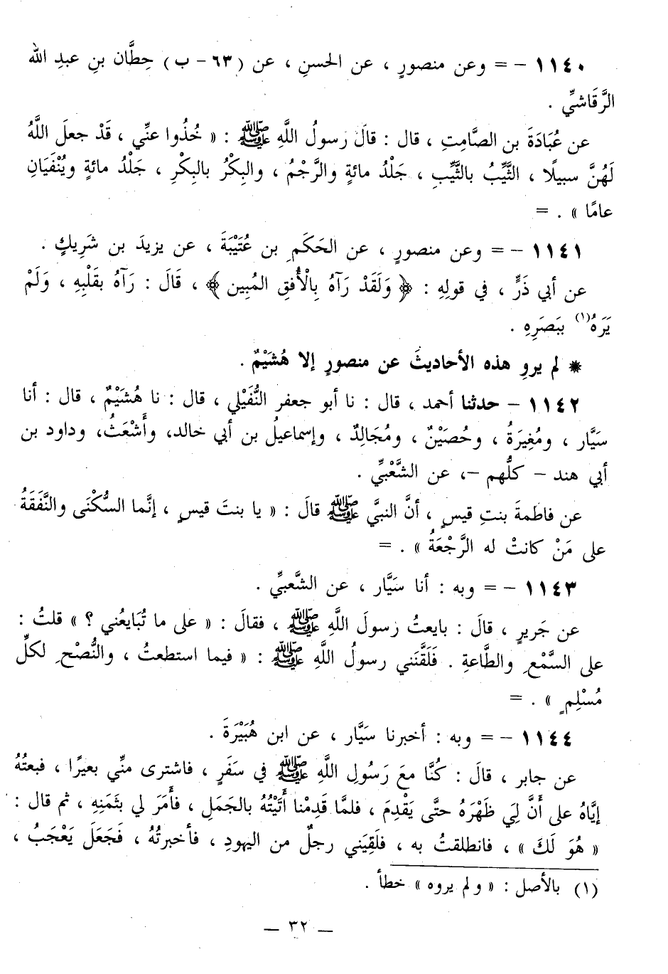 1140 - وَعَنْ مَنْصُورٍ، عَنِ الْحَسَنِ، عَنْ حِطَّانَ بْنِ عَبْدِ اللَّهِ الرَّقَاشِيِّ، عَنْ عُبَادَةَ بْنِ الصَّامِتِ قَالَ: قَالَ رَسُولُ اللَّهِ صَلَّى اللهُ عَلَيْهِ وَسَلَّمَ: «§خُذُوا عَنِّي، قَدْ جَعَلَ اللَّهُ لَهُنَّ سَبِيلًا، الثَّيِّبُ بِالثَّيِّبِ، جَلْدُ مِائَةٍ وَالرَّجْمُ، وَالْبِكْرُ بِالْبِكْرِ، جَلْدُ مِائَةٍ وَيُنْفَيَانِ عَامًا»