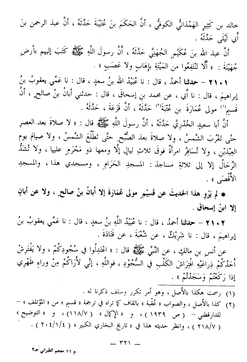 2101 - حَدَّثَنَا أَحْمَدُ قَالَ: نا عُبَيْدُ اللَّهِ بْنُ سَعْدٍ قَالَ: نا عَمِّي يَعْقُوبُ بْنُ إِبْرَاهِيمَ قَالَ: نا أَبِي، عَنْ مُحَمَّدِ بْنِ إِسْحَاقَ قَالَ: حَدَّثَنِي أَبَانُ بْنُ صَالِحٍ، أَنَّ قُسَيْمًا، مَوْلَى عُمَارَةَ بْنِ عُتْبَةَ حَدَّثَهُ، أَنَّ قَزْعَةَ، حَدَّثَهُ، أَنَّ أَبَا سَعِيدٍ الْخُدْرِيَّ حَدَّثَهُ، أَنَّ رَسُولَ اللَّهِ صَلَّى اللهُ عَلَيْهِ وَسَلَّمَ قَالَ: «§لَا صَلَاةَ بَعْدَ الْعَصْرِ حَتَّى تَغْرُبَ الشَّمْسُ. وَلَا صَلَاةَ بَعْدَ الصُّبْحِ حَتَّى تَطْلُعَ الشَّمْسُ. وَلَا صِيَامَ يَوْمَ الْعِيدَيْنِ. وَلَا تُسَافِرُ امْرَأَةٌ فَوْقَ ثَلَاثِ لَيَالٍ إِلَّا وَمَعَهَا ذُو مَحْرَمٍ عَلَيْهَا. وَلَا تُشَدُّ الرِّحَالُ إِلَّا إِلَى ثَلَاثَةِ مَسَاجِدَ: الْمَسْجِدِ الْحَرَامِ، وَمَسْجِدِي هَذَا، وَالْمَسْجِدِ الْأَقْصَى»